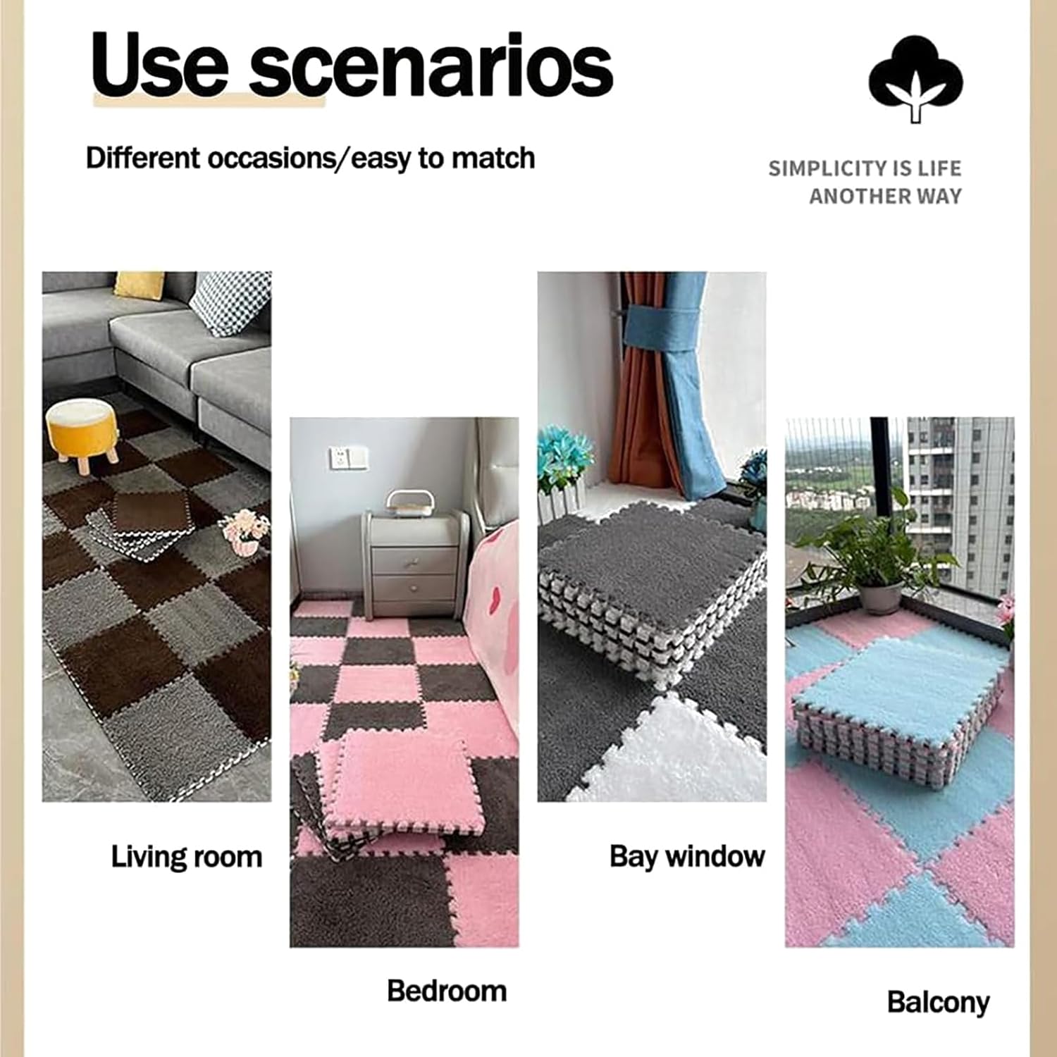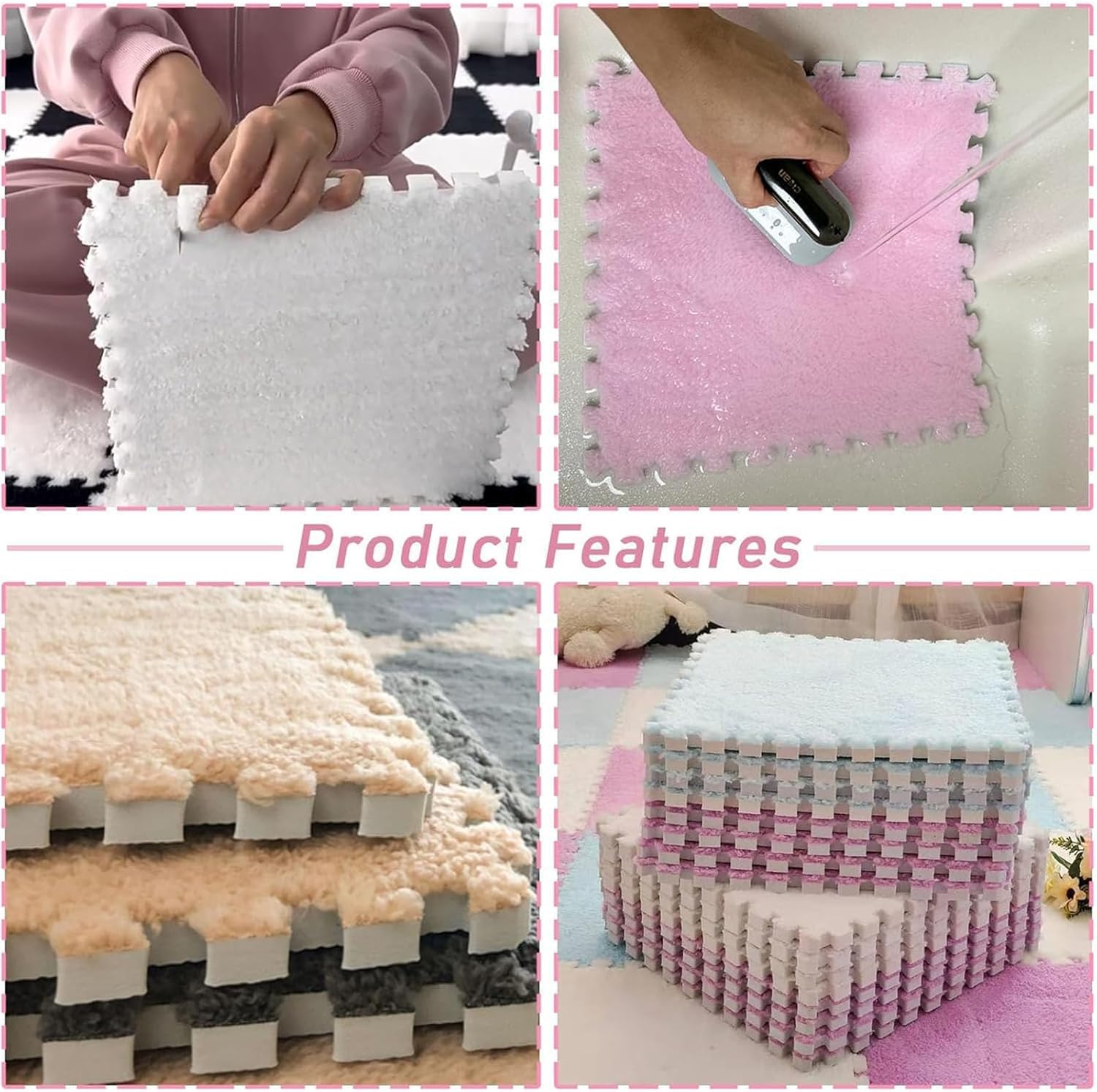 Plush Puzzle Foam Floor Mat SetThis soft, interlocking foam floor mat set features three dreamy colors and a plush surface, creating a stylish and sensory-friendly addition to any room. Perfect for home decor and floor protection, the mats are easy to clean, customize, and install.Specifications:Product Name: Plush Puzzle Foam Floor MatsMaterial: Ethylene Vinyl Acetate (EVA)Single Tile Size: 11.8" x 11.8" x 0.39" (30 x 30 x 1 cm)Coverage per Tile: 0.09 m² (1 sq ft)Set Contents: 10 x Interlocking Carpet TilesFunction: Home Decoration / Floor ProtectionCustomization: Available in single colors and custom quantities upon request.Care & Notes:1. Tap mats together before installing to remove any loose fibers or debris from manufacturing.2. Clean with a damp cloth or mild soap; gently scrub with a soft brush. Air dry immediately. Do not machine wash or vacuum.