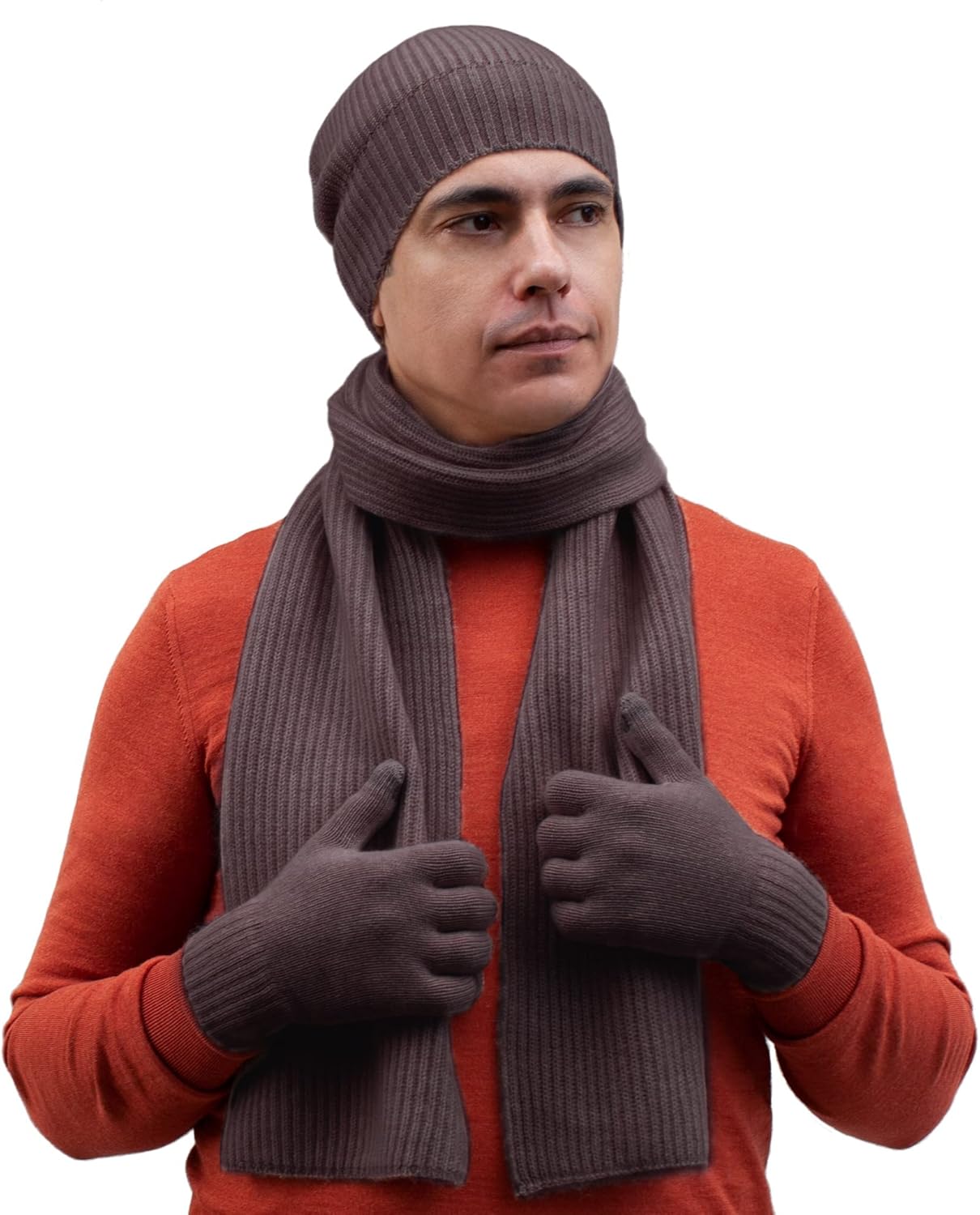 A soft cashmere hat, scarf and touchscreen gloves set will keep you warm. Tight hat's ending saves from the wind. Scarf size: 65 x 9.5″