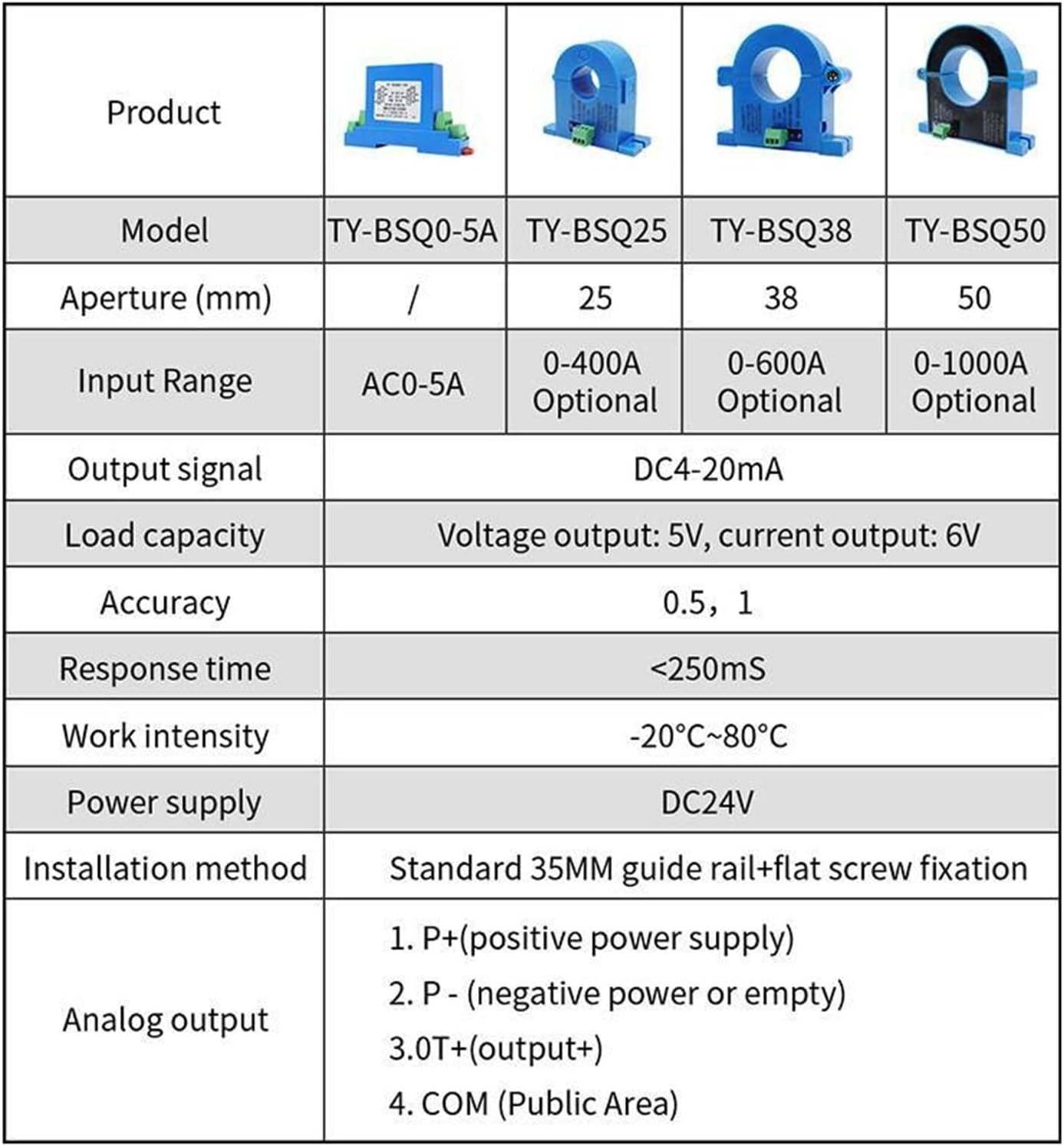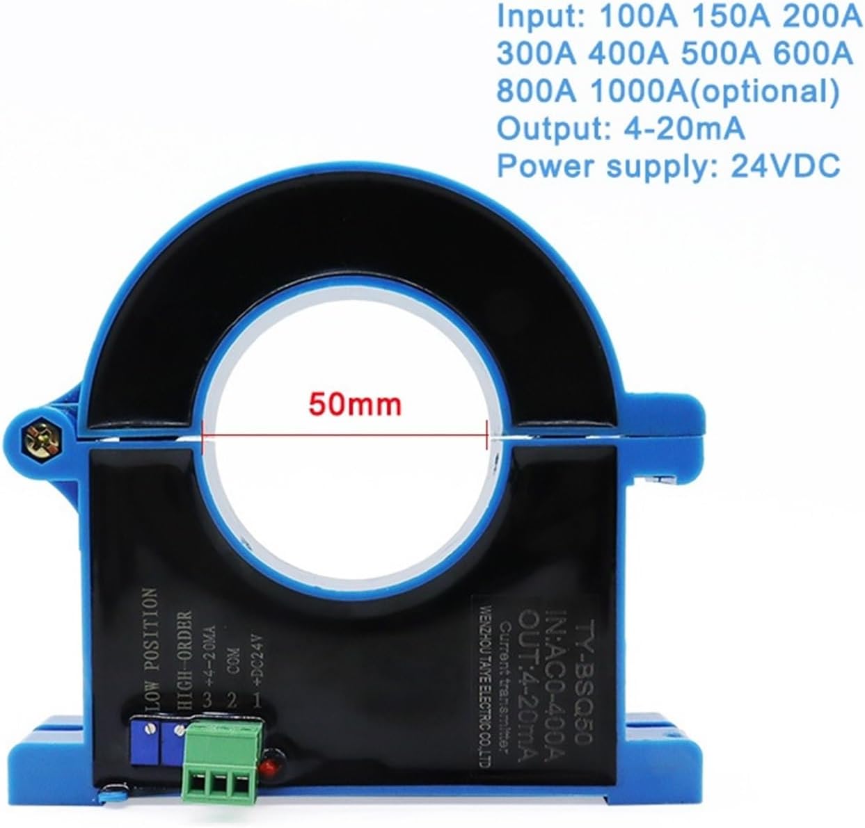 SensorsSpecificationsProduct name: AC-DC current transmitterProduct accuracy: 0.5<;250MSProduct shell: Flame retardant ABS plastic materialIsolation and withstand voltage: 3KV/50HZ, 1MINLoose frequency band: 20-50HzWork intensity: -10 ° C~70 ° CWinding material: copper wireStorage temperature: -25 ° C~85 ° C