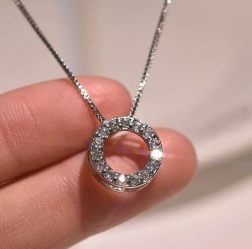 This stunning 2-carat round cut lab-created diamond necklace features a timeless circle pendant design that adds elegance to any outfit. The pendant is crafted from sterling silver 925 with luxurious 14k white gold plating, offering both durability and a brilliant shine that complements the sparkle of the lab-created diamonds. The circular pendant design symbolizes eternity and unity, making it a meaningful gift for someone special or a beautiful addition to your own jewelry collection. Lab-created diamonds provide the same optical and physical properties as mined diamonds while offering exceptional value. This necklace comes complete with a free box chain, allowing you to wear it immediately upon arrival. The versatile design transitions seamlessly from day to evening wear, making it perfect for both casual and formal occasions. Whether you're dressing up for a special event or adding a touch of sparkle to your everyday look, this pendant necklace delivers sophisticated style and brilliant radiance.