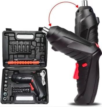 A compact rechargeable electric screwdriver kit designed for everyday household repairs and DIY projects. It features a comfortable ergonomic handle and a pivoting design that allows easy operation in tight or angled spaces. The kit includes multiple interchangeable screwdriver bits and sockets for different fastening tasks, making it useful for assembling furniture, repairing appliances, and light maintenance work. The cordless design offers convenient portability, while the built-in rechargeable battery ensures reliable performance for routine home use.