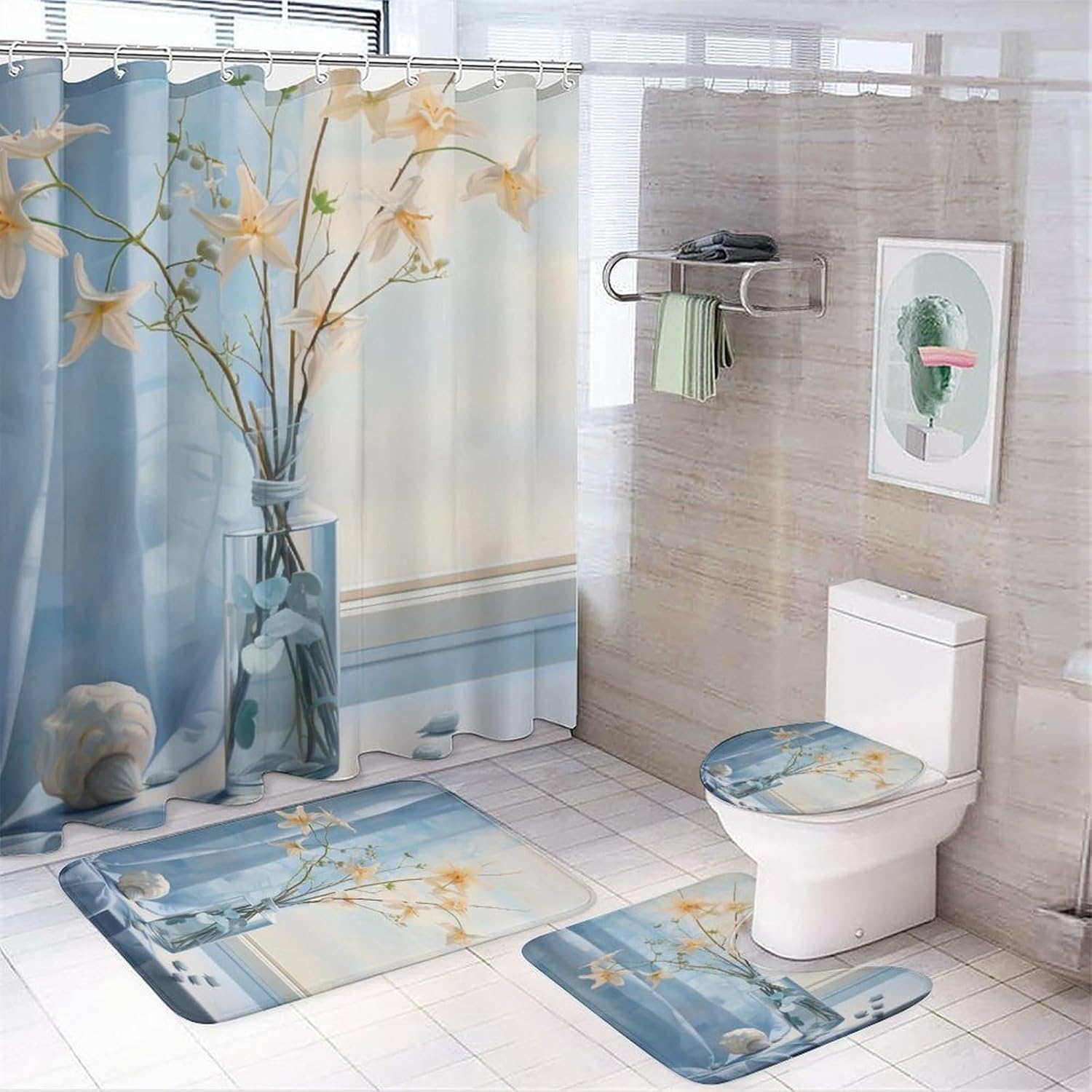 Accessories construction : Floor mat + U-shaped floor mat + Toilet seat cover cover + Shower curtain (with 12 C-shaped plastic hooks) Material: This four-piece set is made of coral velvet + waterproof oxford fabric, the fabric is soft and delicate, skin-friendly and comfortable, with a good sense of touch. coral velvet floor mats are super absorbent, non-slip.EASY TO CLEAN: It's very easy to clean and maintain, usually cleaning just need a hoover to absorb the dust, easy to store and easy to take care of on a daily basis. When not in use, gently roll it up and put it in the corner, it can be used for a long time.WATERPROOF: This shower curtain is made of waterproof Oxford cloth, waterproof performance is good, you can avoid water spraying to other places in the bathroom.Applicable Scenarios : Suitable for home bathroom, guest room, bedroom, living room and other places.Washing instructions: washable, not machine washable.After-sales Service:If you are not satisfied with our printed paintings, please feel free to contact us and we will answer you in the shortest possible time. Your satisfaction is our only pursuit.