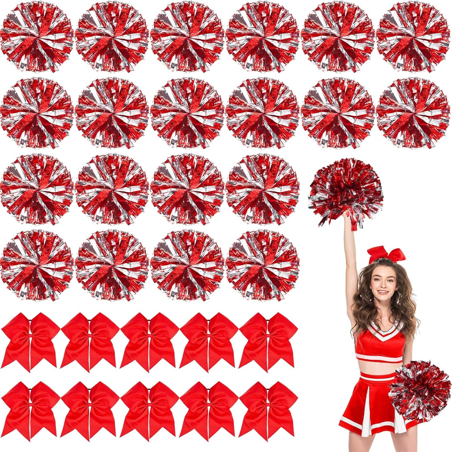Features: Our cheerleader pom poms offer easy grips, and come with sturdy cheer hair bows that hold stably to amount of twirls and jumps. Standout in performances as you cheer and twirl without worrying about slips or mishaps. Our cheer accessories for cheerleaders are not just for cheerleading. They can also be applied in cosplay, sports events, team spirit rallies, and theme parties. Add some shine and excitement to many events. Specifications: Material: Pom pom: tinsel, plastic Cheer hair bow: polyester Pom pom color: silver Size: Pom pom: about 11.81 inches/ 30 cm Cheer hair bow: about 7.87 inches/ 20 cm Package includes: 48 x Cheerleading pom poms 24 x Cheer hair bows Notes: Manual measurement, please allow slight errors on size. The color may exist a slight difference due to different screen displays.