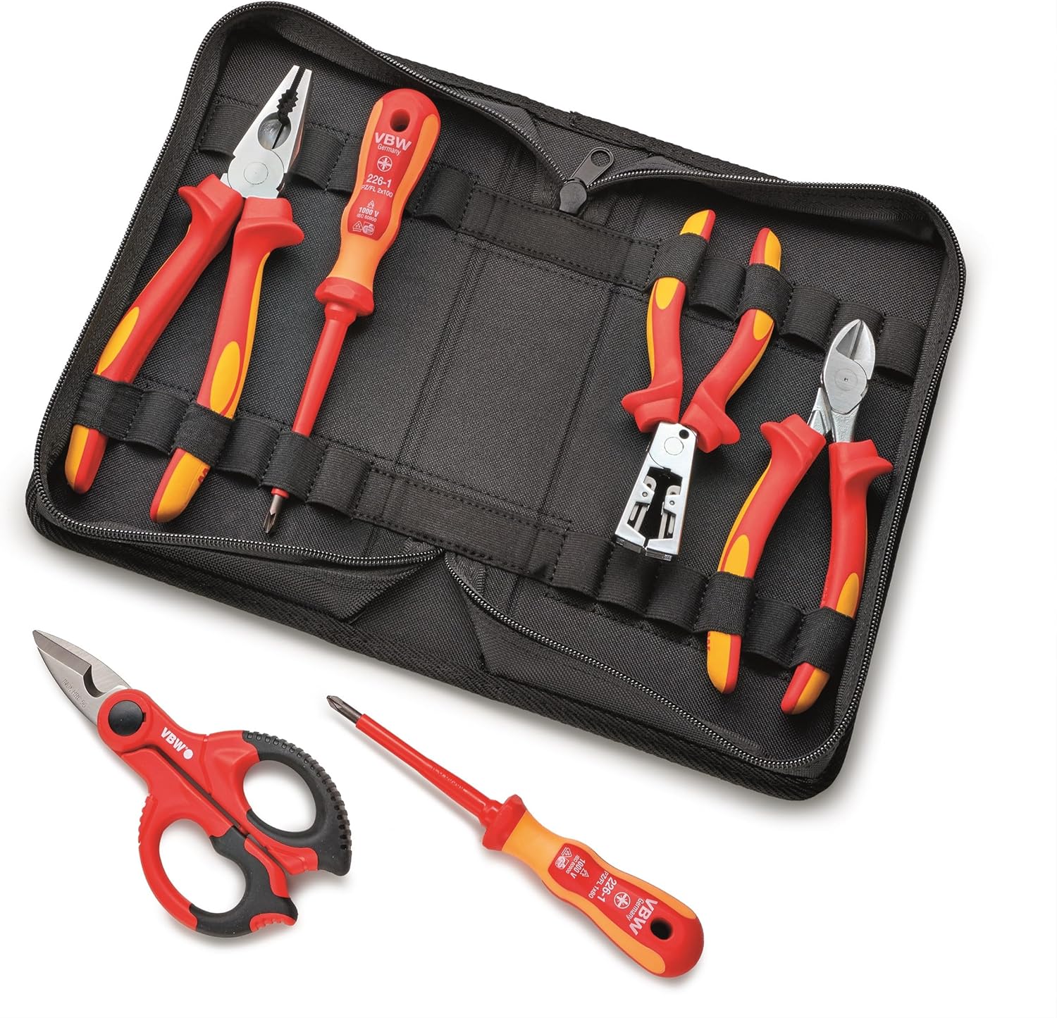 VBW 860020 Professional Electricians Set of 6 V0EN 682/900 piece in high-quality fabric case consisting of: VDE screwdriver PZ/FL1 x 80 mm, 226110 and VDE screwdriver PZ/FL2 x 100 mm, 226115 piece-tested at AC 10,000 V for 100% safety in accordance with IEC 60 900, EN 60 900 and VDE 0682/part 201 approved to AC 10,000 V and DC 1500 V two-component blade resistant with hard/flexible grip 1 x DIN 680 mm V4970 and VDE 0682/Part 201 approved up to AC 1,000 V and DC 1500 V wear-resistant gripping surfaces with hinge DIN ISO 5479B electrician scissors, basic, 497010 VDE combination pliers, 200 mm, 596215 piece-tested at AC 10,000 V for 100% safety according to IEC 60 900, EN 60 900 and VDE precision cutter. VBW is an integral part of the steel will group for excellent tools of the highest quality. Made in Germany. And this has been since 1828. The secret of success is an open: in addition to durable top quality, we are constantly looking for optimization potentials with our design teams that make working with our tools even easier and more efficient.