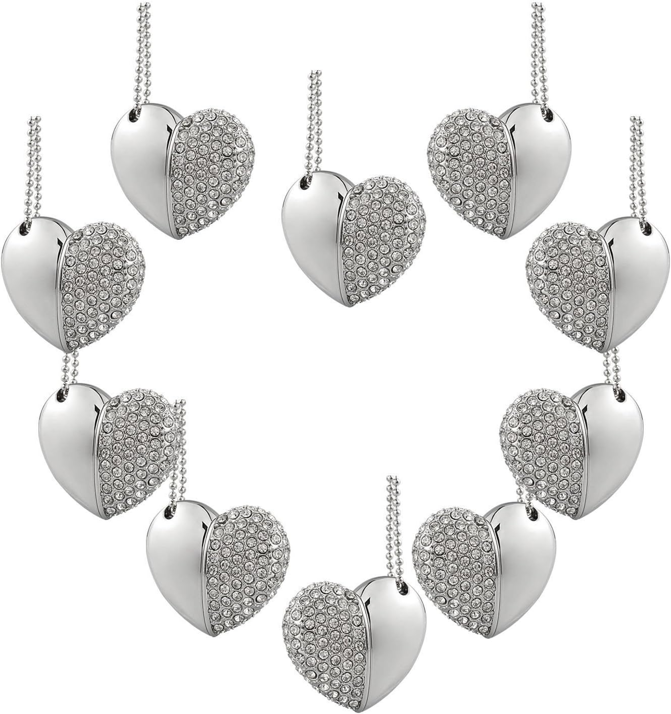 PACKAGE:10 x 8GB USB Flash Drive Silver Heart NecklaceFEATURES:✔Cute heart design USB Thumb Drive Metal Memory Stick and fashionable style✔Grade A original brand flash memory chip. Every Piece is under test before shipping✔With necklace and easy to carry✔No need to install drivers; plug and play✔High quality, easy to useSPECIFCATIONS:✔Support PC Mode: all brands of PC, Laptop HP, Dell, Toshiba,etc.✔Support Win98/ME/2000/XP/Vista/7, Mac OS 9.X✔Support Interface Type: USB 2.0 (Backwards compatible to USB 1.1)✔Speed: Writing speed: 3MB/S-6MB/S; Reading speed: 8MB/S-12MB/S✔Available Capacities: 8GB, 16GB, 32GB, 64GB and 128GB✔Dimensions: 1.61*1.61*0.7in✔Durability: Over 50,000 times read and writeImportant Notice: ✔The actual available capacity for data storage is less than what is listed on the products. As some of the listed capacity on a flash storage device is used for formatting and other functions, thus is not available for free data storage.✔FAT32 is factory default drive format, which is read/write compatible with Windows and Mac OS; while NTFS is compatible with Windows but semi-compatible with Mac OS. Please format it properly if it's needed.Service: Thank you for choosing A Plus+ products! If you are not happy with A Plus+ products, please do not hesitate to contact us. In every customer relationship, A Plus+ strives to be a trusted partner and seeks to achieve 100% customer satisfaction.