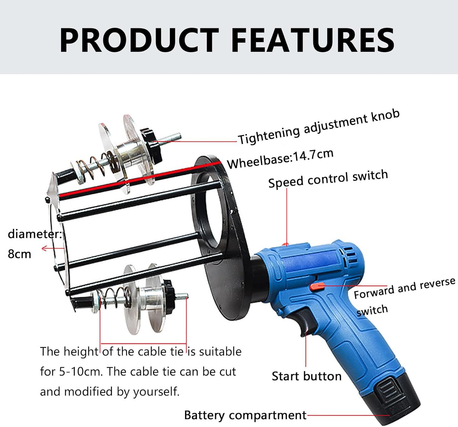 Pipe wire wrapping machineSuitable for central air conditioning connecting pipe winding and big square wire tubes wrapping.Solve the entanglement of various air conditioning copper tubes/ wire wrapping tapes.▲ Specifications- Product Name: Air conditioner cable tie winding machine- Material: Aluminum alloy + ABS fireproof material- Applicable cable tie height: 5-10cm cable tie (can be cut and changed by yourself)- Cable tie adjustment distance: 5-10cm- Wheelbase: 14.7cm- Mouth diameter: 8cm- Frame: Open/Closed- Weight: 1.3kg▲ Package include1*Air conditioner cable tie winding machine kit1*Charger2*Batteries