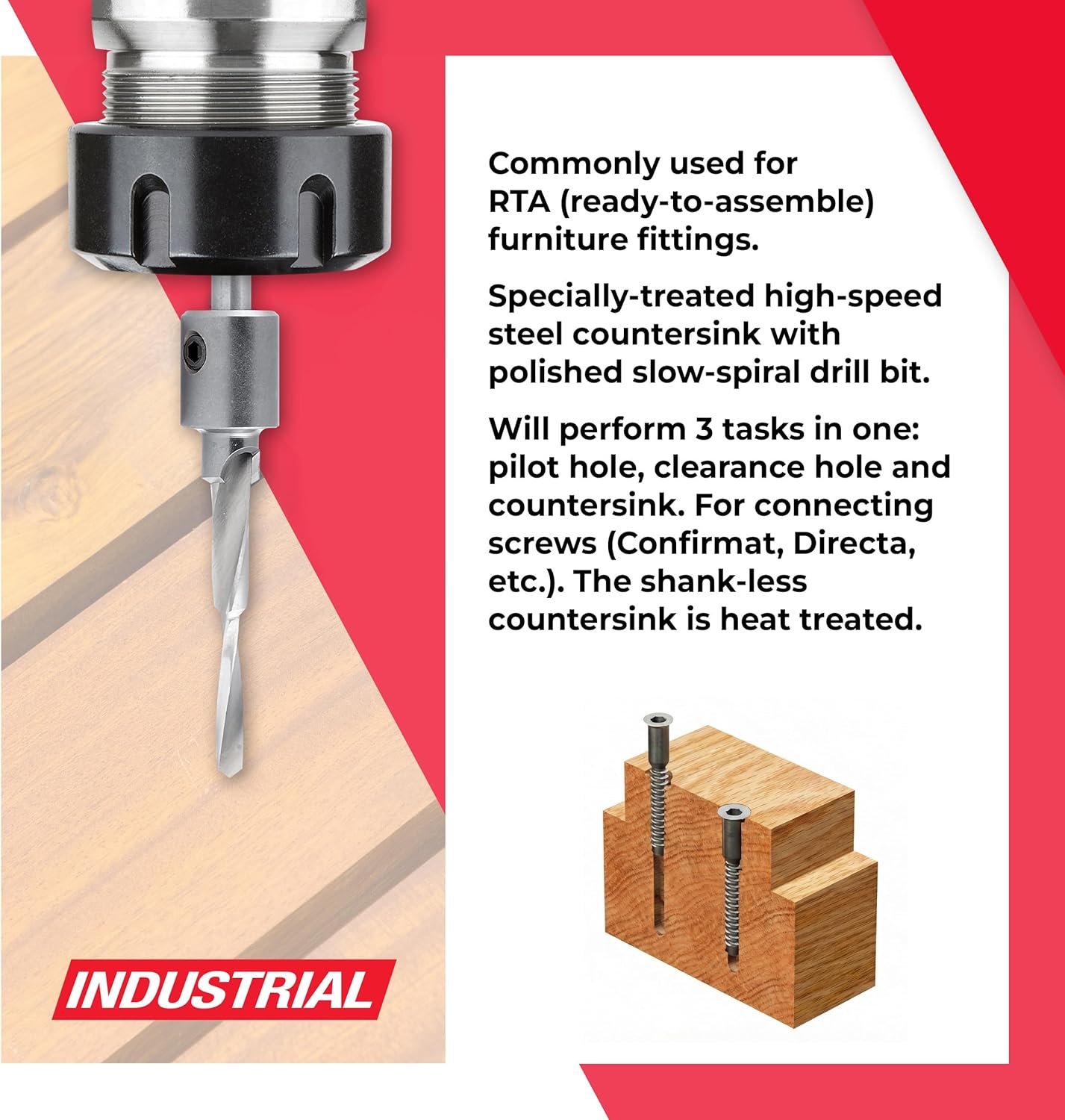 Upgrade your woodworking setup with this professional countersink drill bit designed specifically for creating strong, clean connections in wooden furniture. Ideal for DIY builders and professional installers, this countersink drill bit for wood combines high precision with smooth drilling action. The countersink with polished slow-spiral drill bit delivers consistent cutting performance while forming a pilot hole, clearance hole, and countersink in one step. Ideal for use as a furniture drill, especially on RTA (ready-to-assemble) furniture fittings, it is compatible with Confirmat and compatible with Directa furniture screws. Achieve accurate holes and stronger assembly with every use.