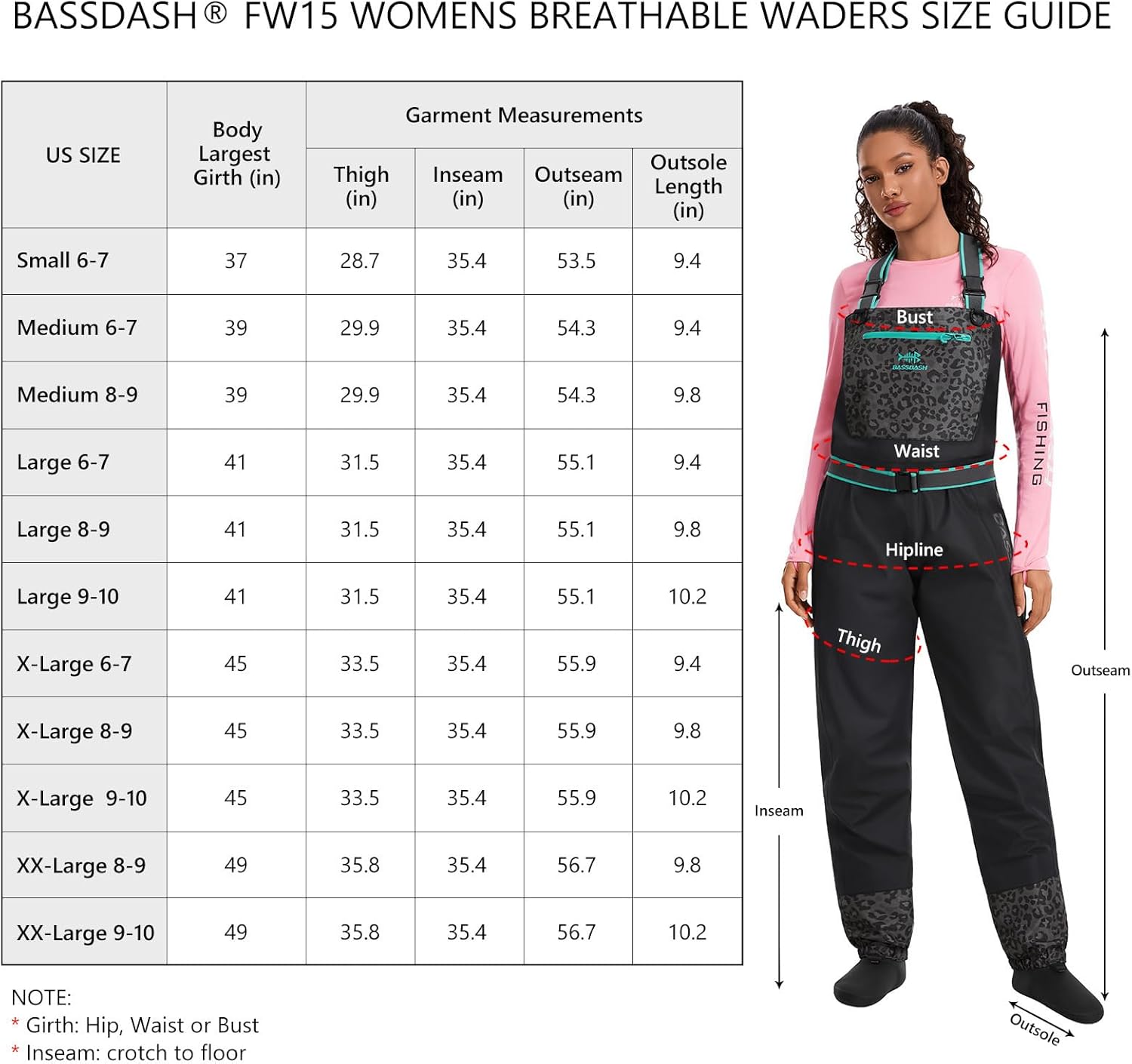 The FW15 women's breathable waders are expertly tailored for a superior, non-bulky fit to the feminine physique. Enhanced with a removable, waterproof phone pouch with touch-friendly screen. The storage system also includes a YKK water-resistant chest pocket, a fleece-lined hand warmer pocket, and a flip-out pocket for essentials. Crafted in black with leopard-print pocket and cuff accents, it features vibrant turquoise highlights for a distinctive style. Durable 4.2mm neoprene stocking feet and integrated gravel guards ensure reliable protection. Every pair is tank-tested for 100% waterproof integrity, designed for all environments—from sea and lakes to rivers and marshes. A mesh storage bag and repair kit are included.