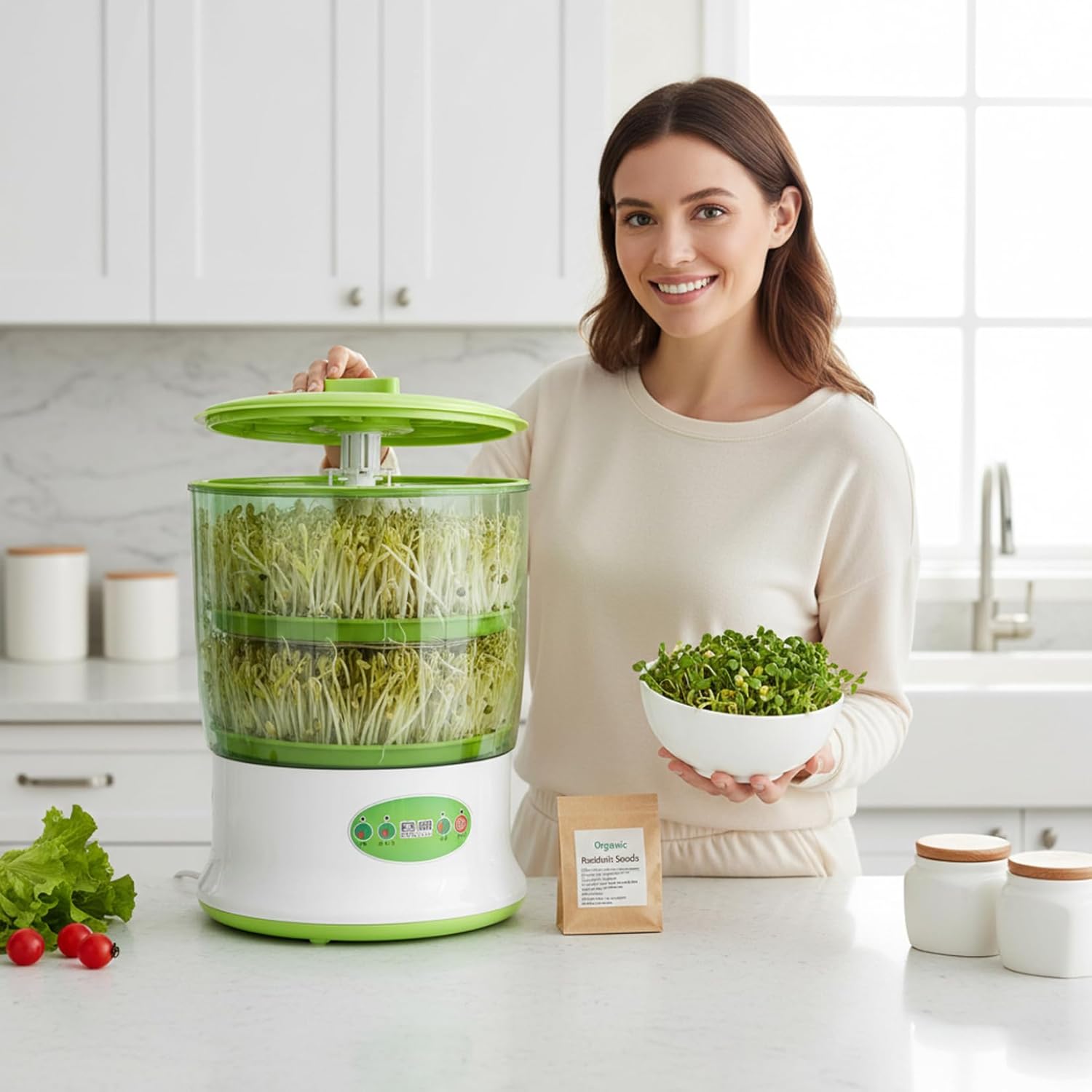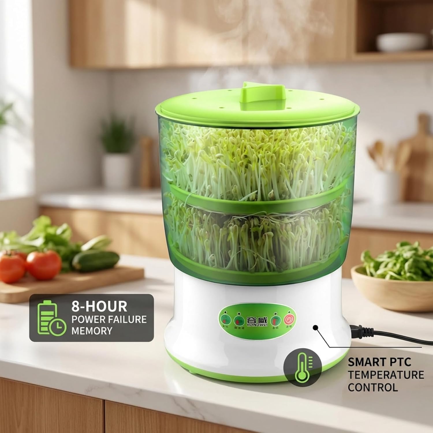 Description: Bring the goodness of homegrown sprouts to your table with our Automatic Bean Sprout Grower. Perfect for health-conscious individuals and gardening enthusiasts, this kit simplifies the process of growing fresh, nutritious sprouts year-round. The intelligent design centers around a fully automated 360° misting system that gently waters your seeds at regular intervals, ensuring even wet without over-saturation. Combined with a consistent temperature setting, it replicates optimal sprouting conditions right on your countertop. Choose between three tailored modes-ideal for different seed types and seasons-to achieve perfect results in just a few days. Crafted from high-quality, food-grade PP material, the sprouting kit is easy to clean, and reliable enough for repeated use. Its compact footprint fits neatly in most kitchens, while the dual-layer design maximizes yield. Imagine adding crisp, flavorful sprouts to salads, sandwiches, and stir-fries whenever you want, knowing exactly how they were grown. Start your indoor gardening journeys today. It's more than a sprout maker; it's a step towards fresher meals and a sustainable lifestyle. Features:. Bean Sprouts Grow Kit. -Color: Green. -Material: PP. -Size: about 26x35cm/10.2x13.8inch. Note:Manual measurement, please allow slight errors on size.The colors may exist slight difference due to different screens. Package Including 1 x Bean Sprouts Grow Kit