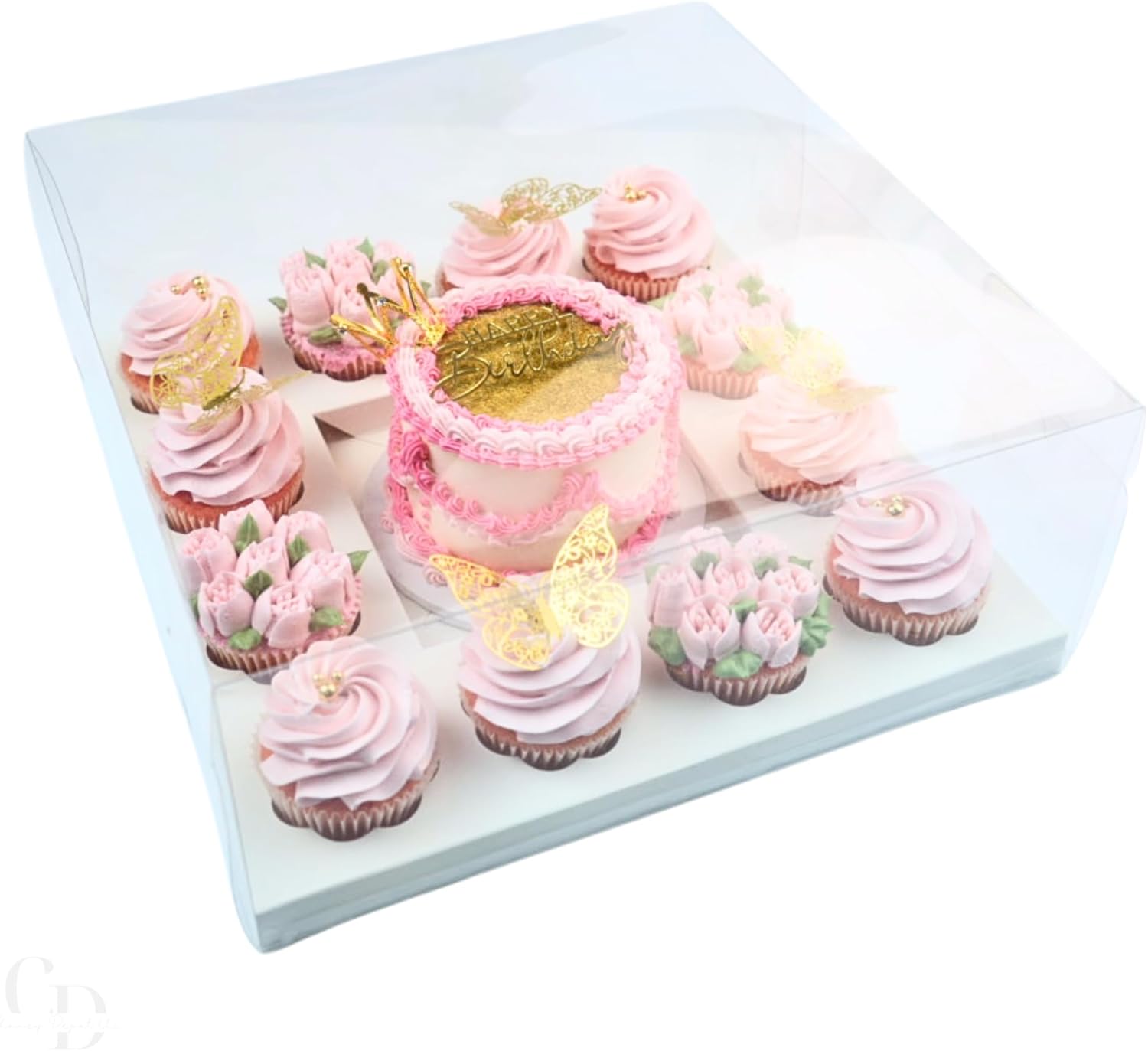 Elevate your dessert presentation with this versatile bento cake and cupcake box from Chaney Depot LLC. This thoughtfully designed storage solution features a clear plastic lid that showcases your delectable creations while keeping them fresh and protected. The box includes a specialized insert that accommodates either 12 standard-size cupcakes or a 6-inch by 6-inch cake, making it perfect for birthday celebrations, special events, or professional bakery use. Crafted from sturdy white cardboard with dimensions of 10 x 10 x 5 inches, this square-shaped container provides reliable support for your baked goods. The flower insert design adds an elegant touch to your presentation. While not dishwasher or microwave safe, this box offers convenient storage and transport for your culinary masterpieces. The clear lid ensures your beautiful creations remain visible while staying secure during transport. Perfect for both professional bakers and home enthusiasts, this box combines functionality with attractive presentation capabilities.
