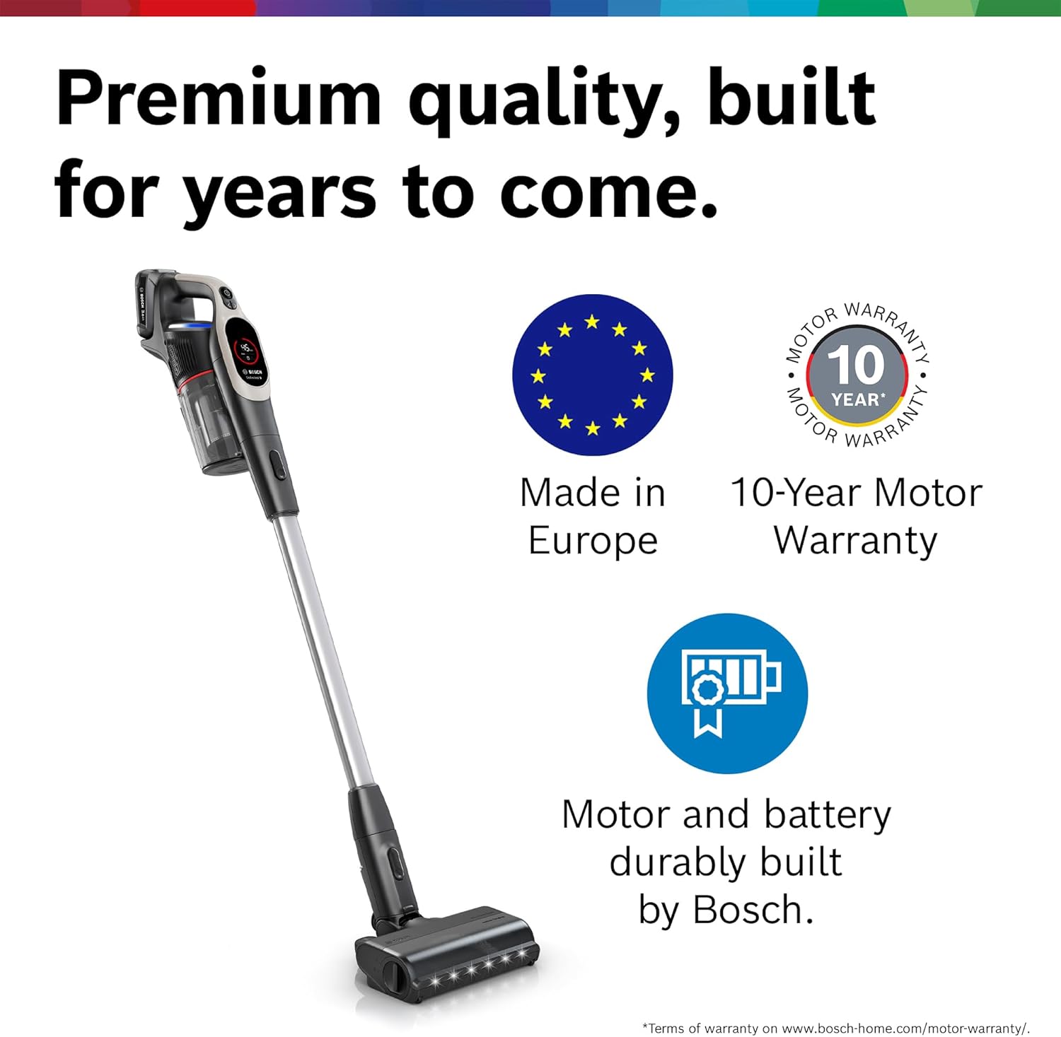 Bosch Unlimited cordless vacuums boast outstanding cleaning performance with its MicroClean Technology, which picks up even invisible particles and uniquely confirms when surfaces are REALLY clean. Its convenient and ergonomic features transform cleaning routines. ¹ Dust pick-up measured in Turbo mode on hard floors with crevices. Tested according to IEC 62885-4:2020/A1:2023. ² Compression increases the dust receptacle capacity (weight of compressed vs. uncompressed dust with same volume) based on Bosch internal test results with a mix of fiber material (cl. 7.2.3) and test dust (cl. 5.12.2.2) acc. to IEC 62885-2:2021. ³ Tested according to ASTM F3150. ⁴ Tested according to IEC 62885-4:2020/A1:2023. ⁵ Compared to standard 1amp charger that comes with the docking station.