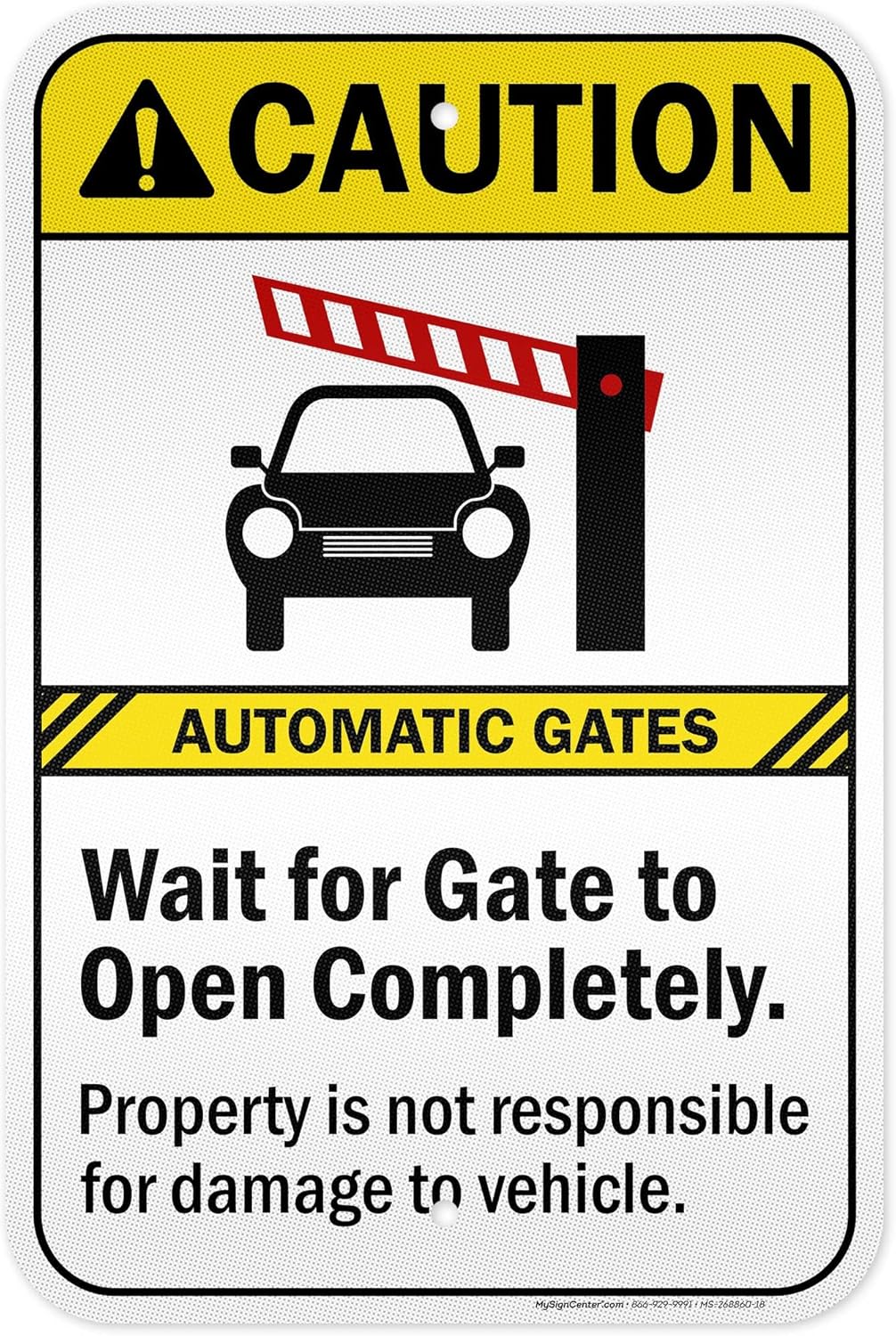 Caution Automatic Gates Wait For Gate To Open Completely Property Sign, 18x24 Inches, 55 mil thick HDPS (high density polystyrene), Made in USA by My Sign Center
