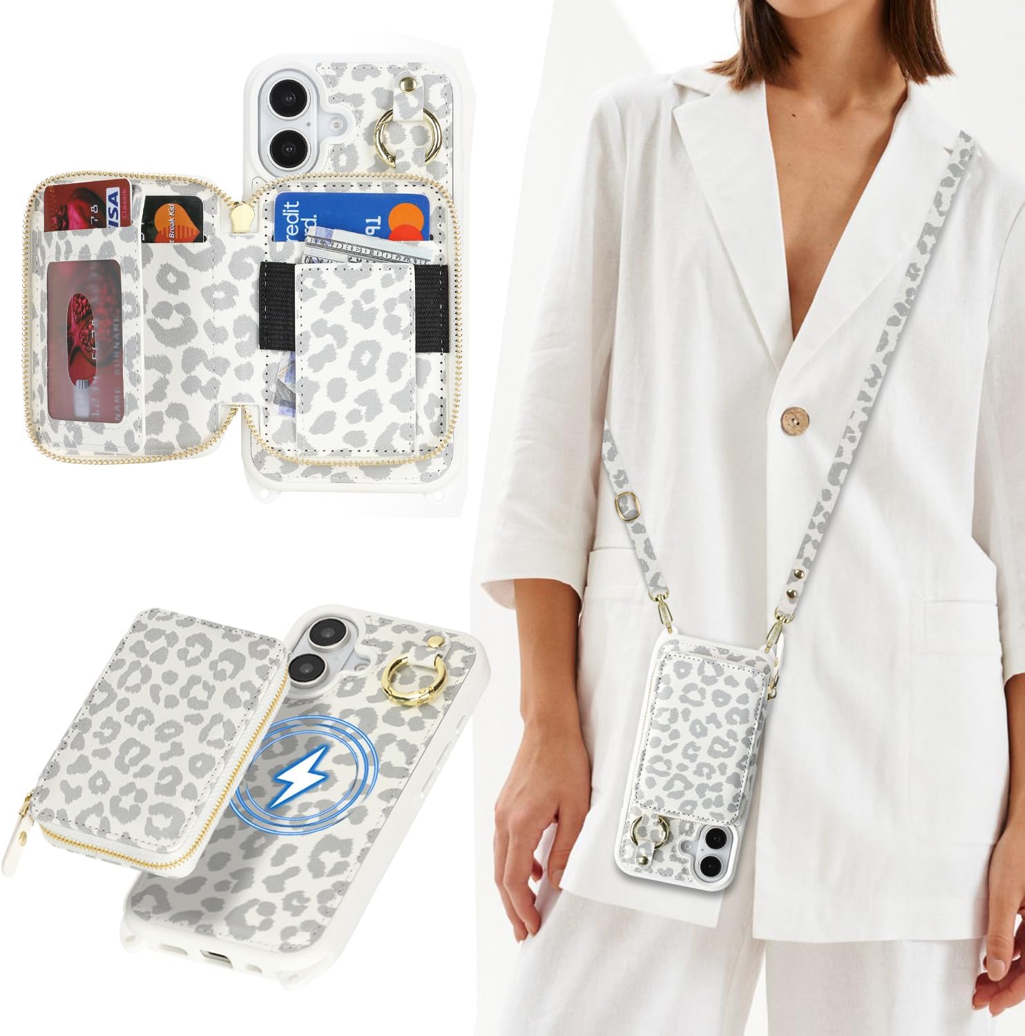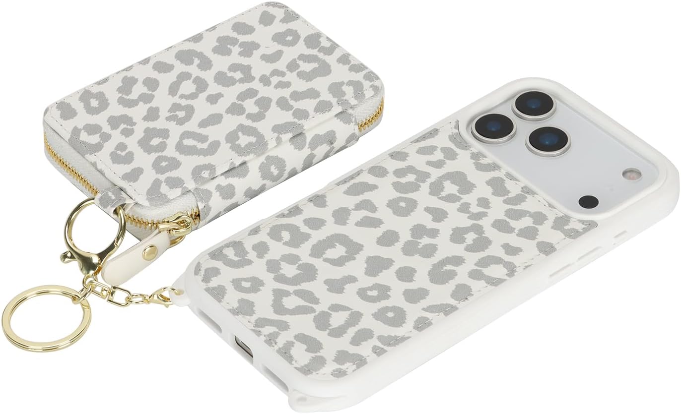 Cavor for iPhone 17 Pro Wallet Case with Card Holder for Women Men, for iPhone 17 Pro Case with Strap, Crossbody Lanyard Phone Case, Magnetic Detachable Compatible with Magsafe-White leopard