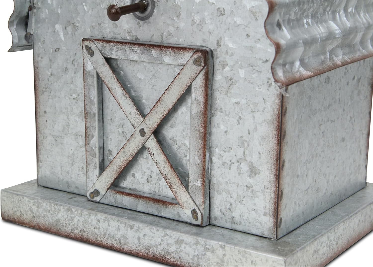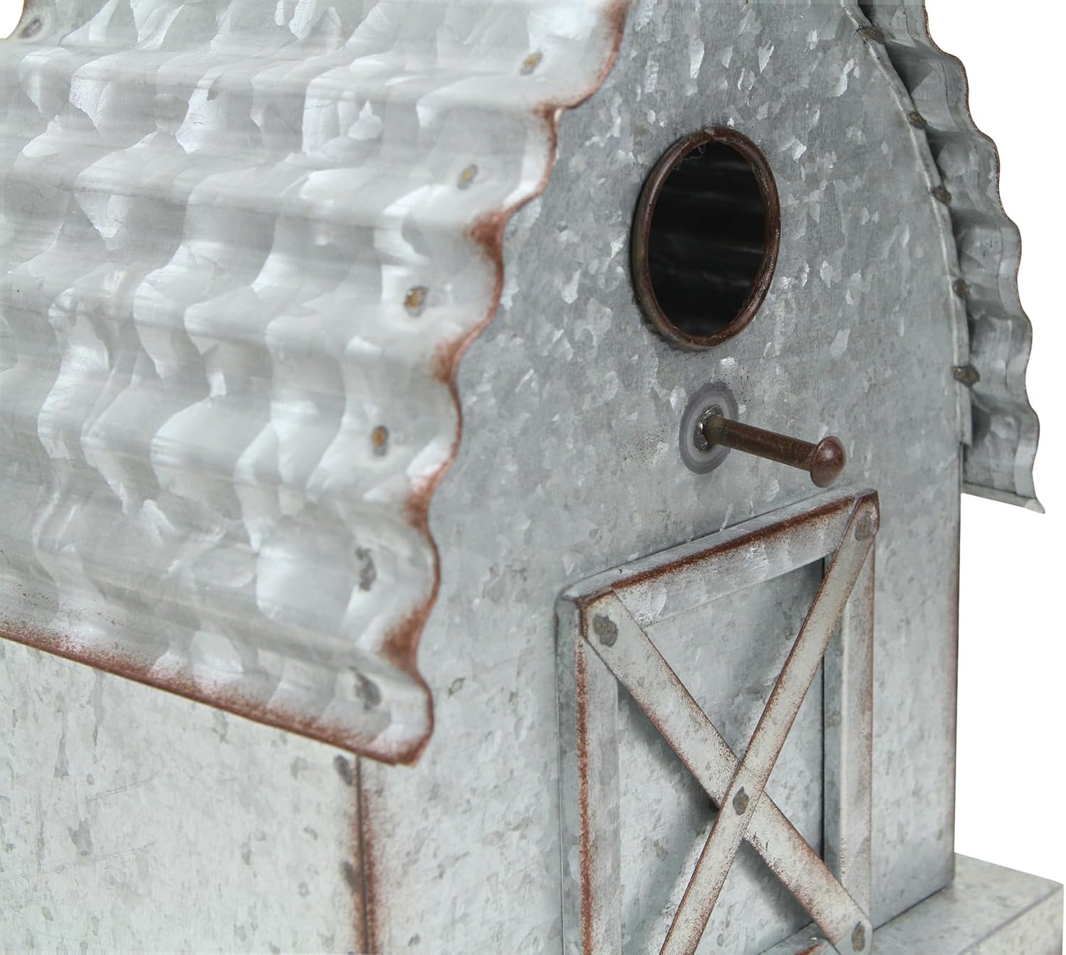 Serving as both a decorational and functional piece, birdhouses help complete themes ranging from Farmhouse to traditional garden. This piece in particular features a galvanized construction with a raised, barnyard design. Whether serving as a shelf decor piece or an entryway addition, this birdhouse will complete any look.