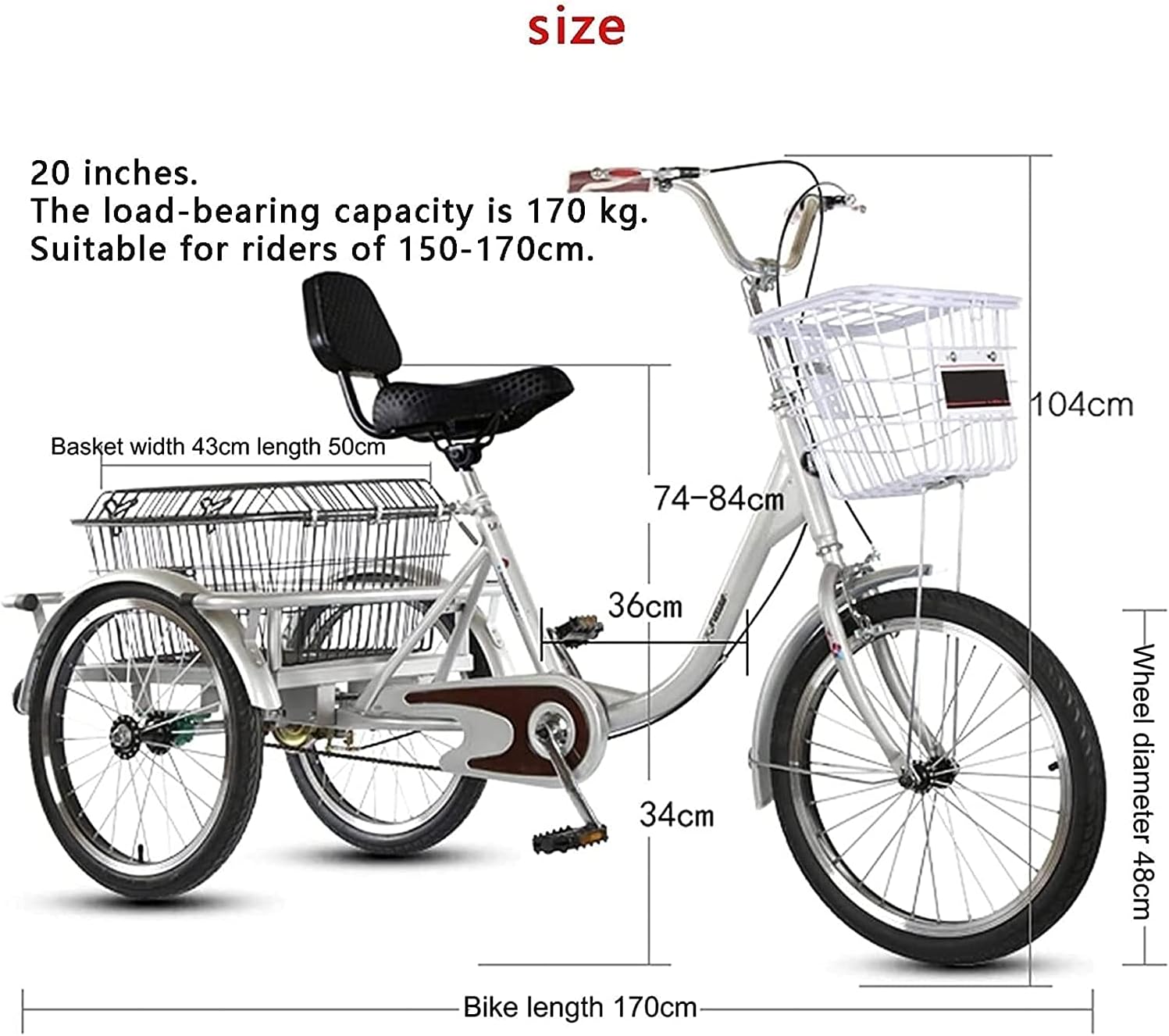 ※(. ? ? ?)※ Bicycle is the best gift for parents and family. Your wife can use it to pick up and drop off children. ※(. ? ? ?)※ Please note: You need to install it yourself, the installation is relatively simple, you can contact us if you have any questions. Since the tricycle is a large product, the product may be slightly scratched during transportation. If you mind, please don't buy. Specification Wheel size: 20 inches Speed: single speed Body material: high carbon steel body Load capacity: 150kg Rider's height: 150-180cm Shopping basket size: 50x43cm Brakes: front and rear double brakes, safe riding Seat: 74-84cm height adjustable Handle: adjustable Tires: thickened run-flat tires, non-slip, no rollover Wheel hub: thick aluminum alloy ring Chain: Anti-rust chain Net weight: 30kg Packing list: adult tricycle x 1 Note: You need to install it yourself, but don't worry, it's easy ※(. ? ? ?)※ You can contact us at any time if you have any questions in the process of buying products, we will ask you to answer your questions, and hope that you have a happy shopping and bring you a happy shopping experience!