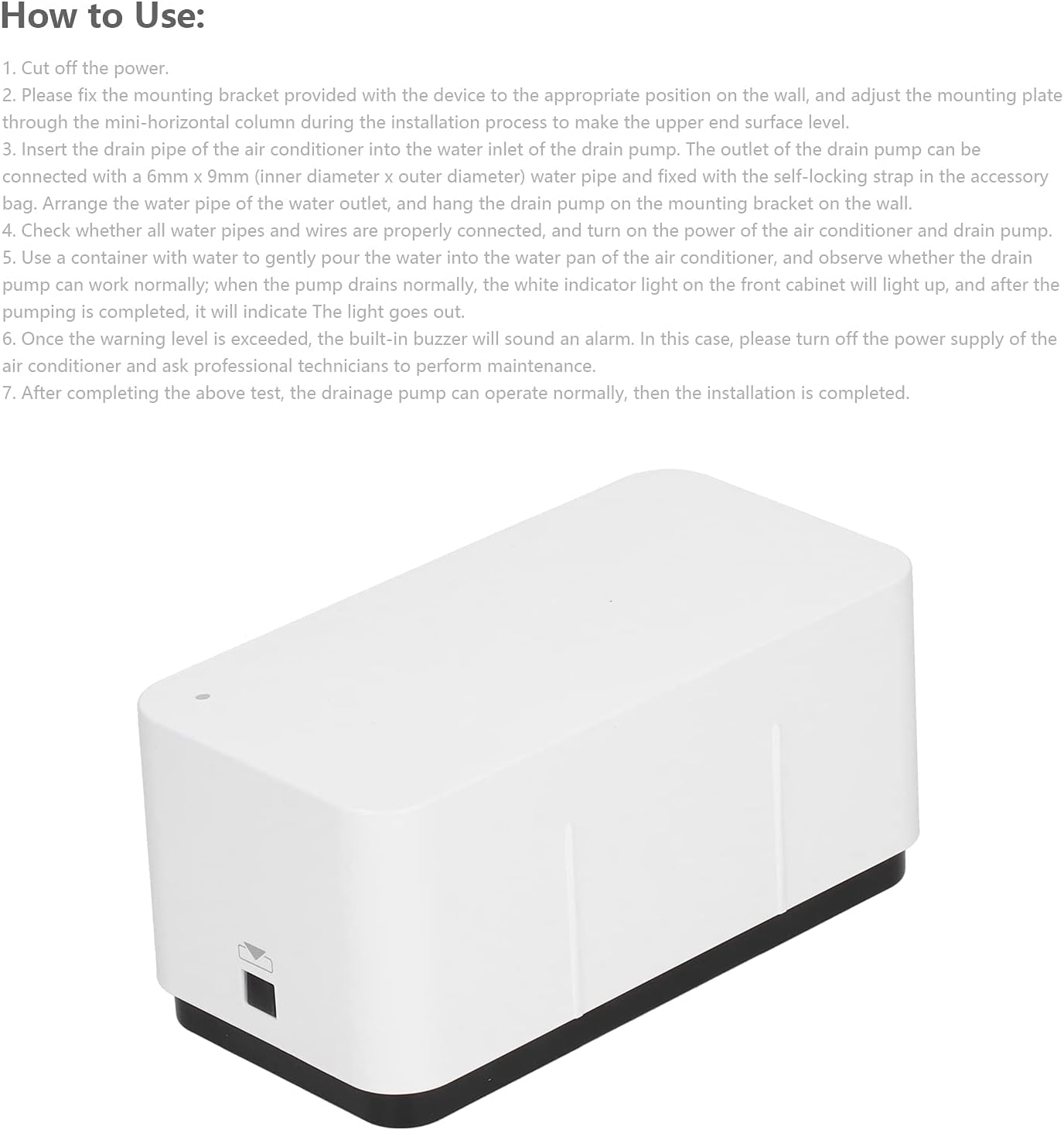 | Included Components | Drain Pump, Connection Line, Screws, Expansion Screws, Buckle, Cable Tie, User Manual |