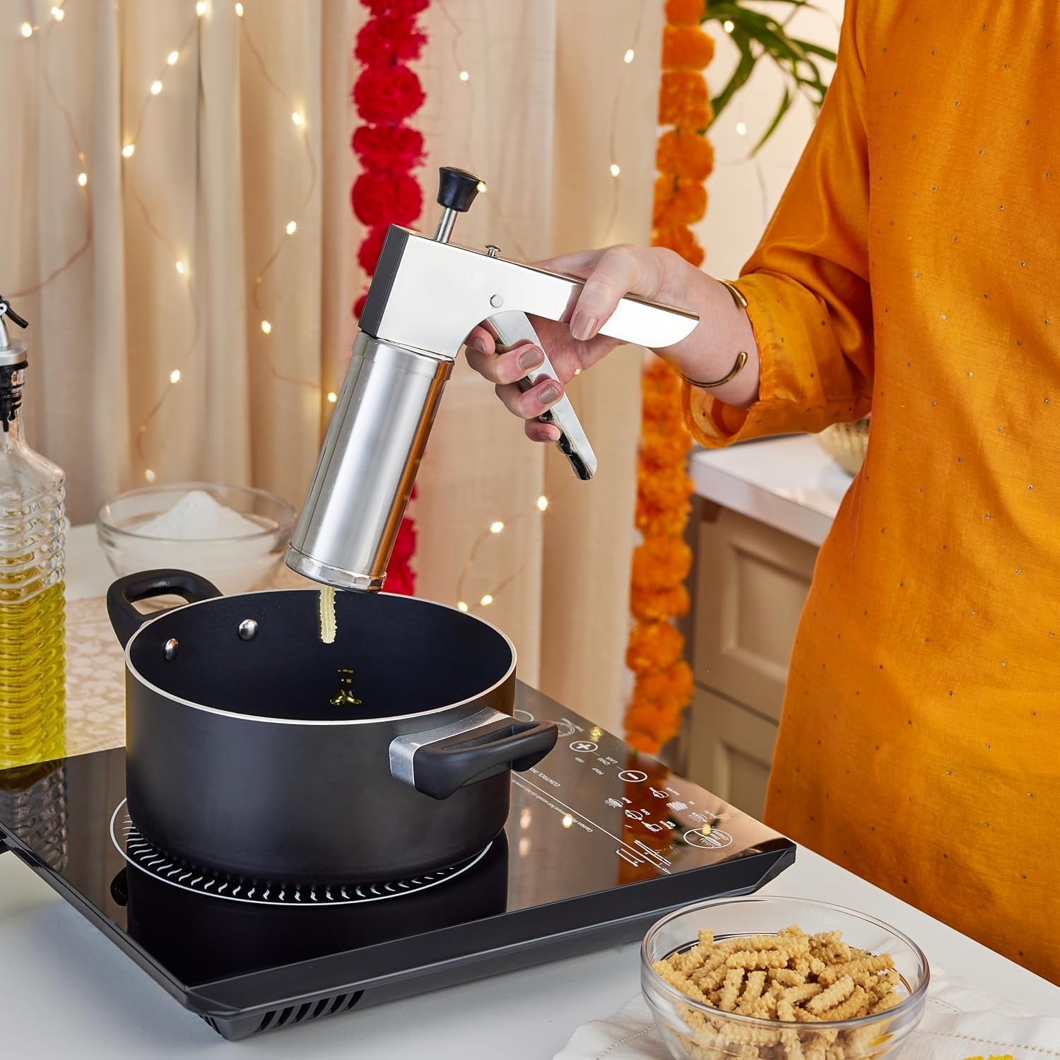 kitchen press is made from 100% food-grade stainless steel, making it safe for everyday cooking. Its heavy-gauge stainless steel body makes it rust free and sturdy.The press mechanism at the top removes the need for manual turning. So, you can make murukku, chaklis, rice sevai or pasta conveniently at home.It comes with 15 attachments for making different-shaped food items. You can enjoy creating a variety of noodles, pasta, murruku and many more fun snacks.