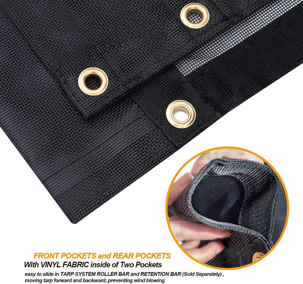 Features: 1.Double pockets in 6'': tough vinyl- coated fabric sewn inside of pockets improve the durability. Easily applied on Dump trailer tarp system or dump truck tarp system. 2. Strong Goods Protections: dump trailer tarp/ truck tarp heavy duty mesh secure the goods in one place with tie downs can be applied on tearing proof grommets. Heavy duty construction protect mesh from wind blowing over while keep tarps breathable, longer lifespan than usual. 3. Superior materials: 10oz/ sqyd black heavy duty polyester/ vinyl coated mesh, 1000Dan x 1000Dan yarn, UV, rot, tear and rip resistant. 4. Extra strong grommets: the tearing, rust proof brass grommets in every 2 feet around the hems making sure you can tie it down easily and secure the goods. 5. Reinforced hems: 2'' polypropylene webbings double stitched at the edge to enhance the durability , rip and tear resistance. 6. Tarp Sizes: 6X14,7X12,7x14, 7x20, 7x18 ....Many Sizes ,customization of the tarp sizes are available. And to help size choosing, tarp width should not go beyond the width of bulkhead or the cab shield, the length should be 2''to 3'' longer than body.