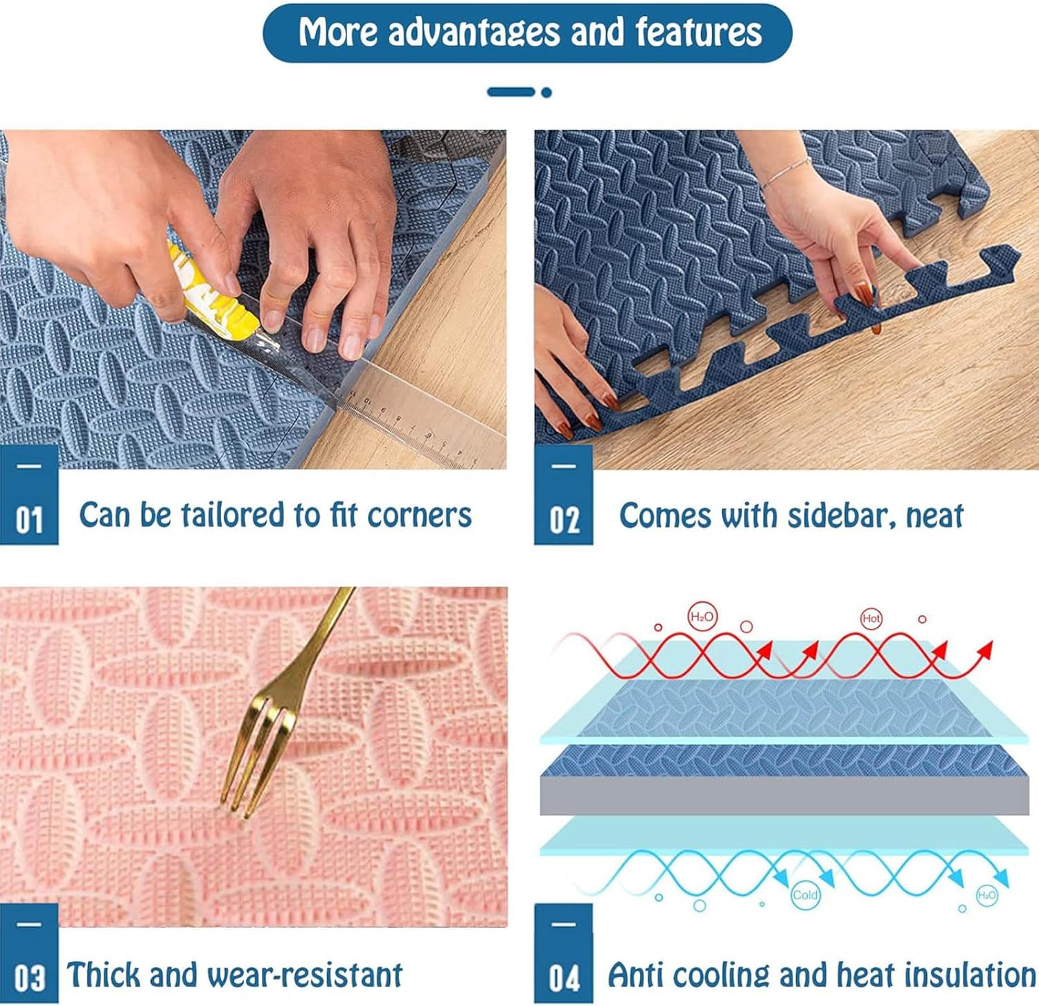 - Category: Interlocking Foam Tiles- Material: PE- Style: Leaves texture- Shape: Square- Color Options: Navy Blue, Beige, Blue, Coffee, Red, Green, Grey, Lemon Green, Light Blue, Orange, Pink, Purple, White, Yellow- Size Options: 12x12x0.4in, 12x12x0.5in, 12x12x1.0in, 24x24x0.4in, 24x24x0.5in, 24x24x1.0in- Cleaning Type: Hand washPackage Includes:- 20 Foam Mats- 2 BordersEnsure your child has a secure and enjoyable space for learning and playing.