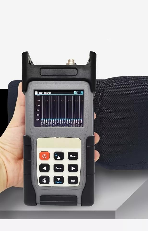 Features Simultaneously test and show 18 wavelengths Friendly interface and easy operation Save and upload test results via USB port 1000 records Columnar graphics or list mode to show test data Color TFT-LCD display, high resolution 320*240 Built-in clock and can edit test fiber number Quick start operation, requiring no warm-up time Light weight Specifications Wavelength Range: 1270 ~ 1610 nm Number of Channels: 18 Wavelength resolution: 20nm Measuring Wavelength (nm): 1270/1290/1310/1330/1350/1370/1390/1410/1430 1450/ 1470/1490/1510/1530/1550/1570/1590/1610 Dynamic range: +10 to -40dBm Resolution: 0.01dB Optical interface: FC/PCF(FC, LC, ST available) Operating Temperature: -10 to +60℃ Power supply: Rechargeable Battery/AC power adapter(Batteries are NOT included in the package) Time of Operating: 10h Dimension: 40.5*21*25cm Weight: 2.6kg