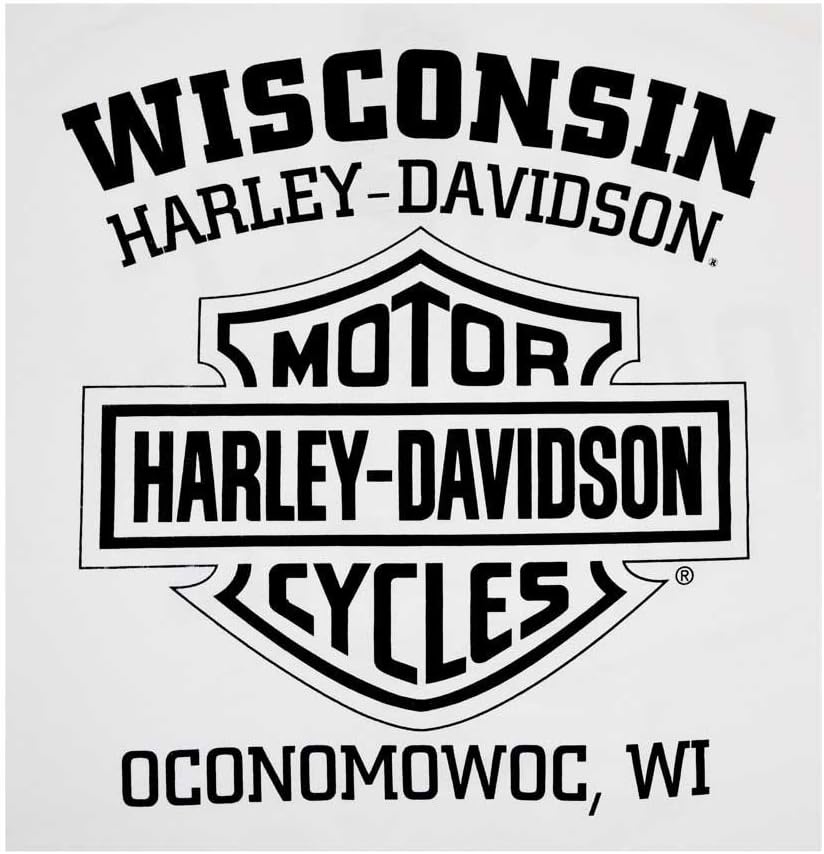 Harley-Davidson Men's Bar & Shield Tee. Highest quality 100% cotton white long sleeve shirt with orange long Bar & Shield graphic on left side of chest and down both of the arms. Back features our Wisconsin Harley-Davidson Dealership logo. printed in orange..