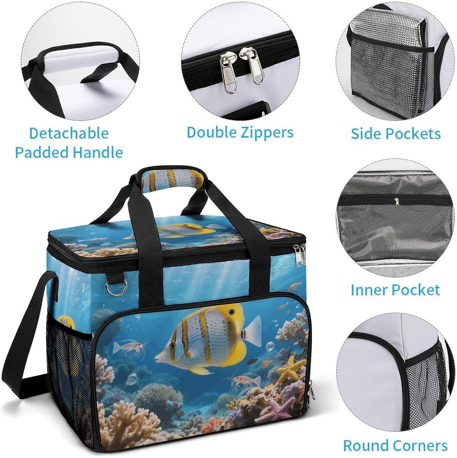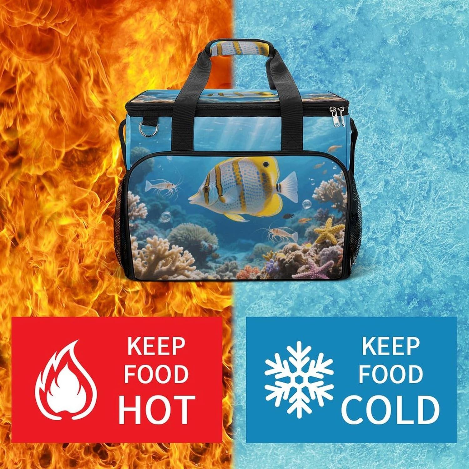 Take Your Meals Anywhere with Ocean Fish Grocery BagsFood Container Carrier Oxford Fabric Picnic Bag Heat Retaining Food Bag Camping Cooler BBQ Accessories Cute Picnic Bag with Pockets Insulated Food Bag for Work Insulated Lunch Tote Bag Camping BagTemperature Control That WorksThe upgraded aluminum foil lining creates an effective thermal barrier. Your drinks stay refreshingly cold, and your hot dishes maintain their warmth for hours. No more lukewarm meals during outdoor outings.Thoughtful Storage DesignTwo side mesh pockets - Perfect for water bottles or umbrellasFront zippered pocket - Keeps keys, phone, or condiments organizedInternal mesh pocket - Stores utensils, napkins, and small essentialsMain compartment - Spacious enough for food containers and snacksBuilt for Daily AdventuresConstructed from high-density oxford fabric with reinforced stitching at stress points. The double zippers are sturdy and smooth-operating. Reinforced handles let you carry heavy loads with confidence.Carry Your WayHandles for quick grabbingStands upright for easy packing and accessPerfect For:Picnics in the parkBeach days and pool partiesCamping and hiking tripsOutdoor concerts and festivalsDaily work lunchesGym and fitness classesRoad trips and travelGrocery shoppingSpecifications:Dimensions: 15.4 x 11.8 x 11.8 inchesMaterial: High-density Oxford fabricLining: Aluminum foil (insulated)Closure: Sturdy double zippersPockets: 2 side mesh, 1 front zipper, 1 internal meshCare: Hand wash or machine wash, do not bleachNote: Food containers and utensils shown in images are not included.