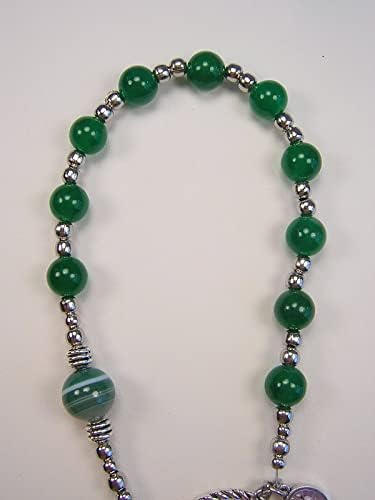 Great Gift! This Beautiful One Decade Penal Rosary is handcrafted with 8mm Green Agate and 10mm Green Banded Agate Beads. Genuine Gemstone Beads. Dark Green The Rosary is 11 3/4 inch Long including the Ring. Celtic Penal Crucifix Beautiful Large Celtic Penal Crucifix. This Crucifix has a Very Unique and Interesting History to it. Made in Italy, silver oxidized and is 2 inch long. Penal rosaries and crucifixes have a wonderful story behind them. Penal rosaries and crucifixes were used during the times when religious objects were forbidden. It was illegal to be Catholic and being caught with a rosary could mean imprisonment or worse. A penal rosary is a single decade with the crucifix on one end and a ring on the other. When praying the penal rosary you would start with the ring on your thumb and the beads and crucifix of the rosary in your sleeve, as you moved on to the next decade you moved the ring to your next finger and so on and so forth. The unique design of this crucifix with very narrow crossbars made it very easily concealed in a hand or sleeve. This allowed people to pray the rosary without the fear of being detected. The symbols on the crucifix are as follows; Inscription, Crown of Thorns, Chalice, Hammer, Cords (the scourging), Five Wounds, Spear, Ladder, Bowl, Nails, and Rooster. St Patrick Enamel Color Image Silver Oxidized Medal. Medal will vary from 1/2 inch to 3/4 inch and round or oval. 1 inch Twisted Design Ring. Each Rosary will have a unique 10mm Green Banded Agate as no 2 gemstones are exactly the same. Handcrafted using Antique Silver Plated findings and High Quality 49 strand Beading Wire Black Pouch and Gift Box included.p>Perfect gift!