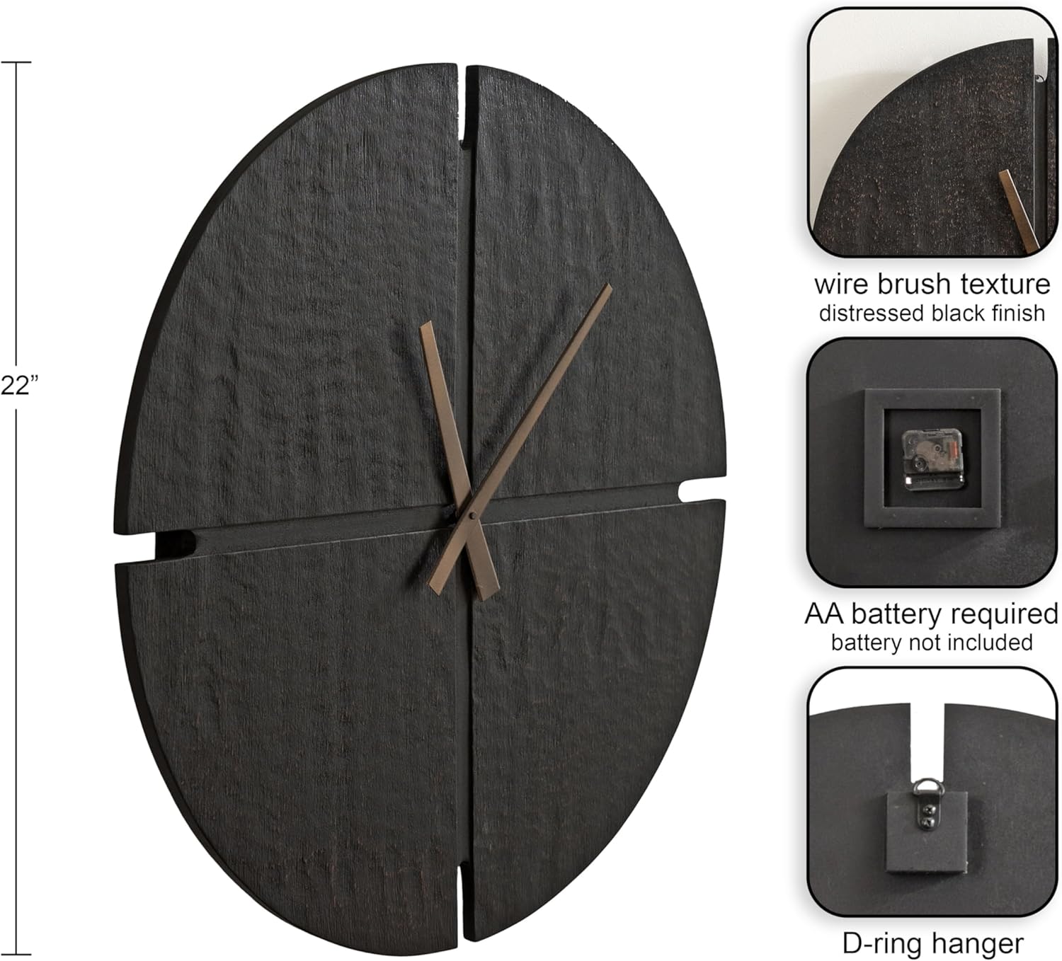 Add some personality to your home or workspace with this Nirav wall clock from Kate and Laurel. The minimal clock features a modern design inspired by contemporary aesthetics, giving your space a clean, sophisticated look. The clock itself is numberless, with a distressed black finish with bronze hands. The face of the clock features a wire brushed look that introduces more texture to your home. The minimalist design looks great in any space, whether you decide to hang it in your living room, kitchen, bedroom, or dining room. It also looks great as a functional replacement for wall art, an entryway conversation piece, or a tone-setting, minimalist accent for your home office. The round clock's diameter is 22 inches, giving your space a decorative statement piece. It has a unique depth that makes the clock feel as if it jumps off of the wall. This clock's functional design requires one AA battery to run, making it ready to give you the time at any point of the day. The AA battery does not come included with this product, but the clock requires no assembly.