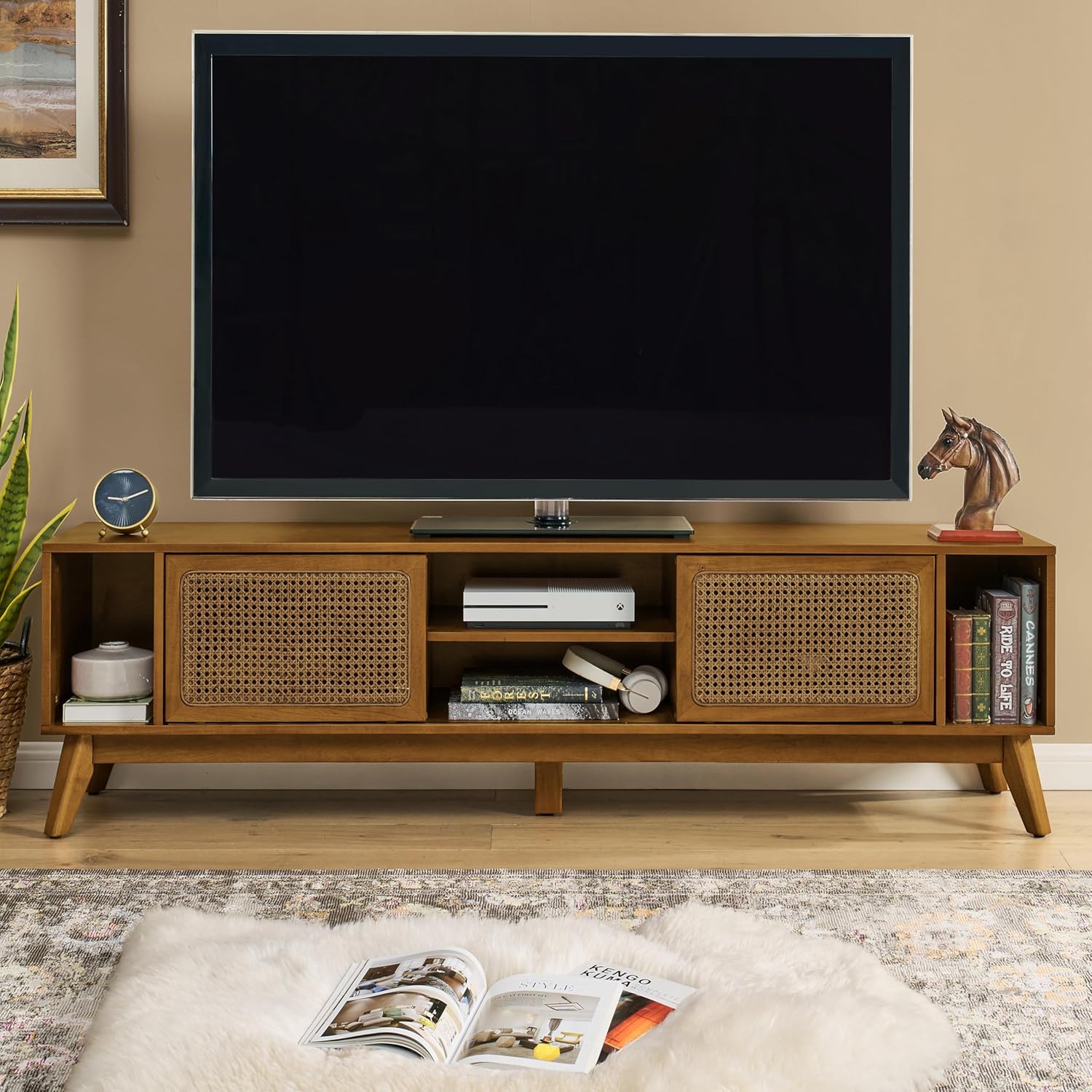 Perfect TV Stand furniture Television Stands Entertainment Center Media Console Drawer Storage Cabinets for entryway hall foyer hallway Video Room bedroom Living room or office. Dimensions Product Details Product Size : 59"Wx15.75"Dx19.625"H Package Size : 63.13"Wx18.88"Dx7.75 "H Net Weight : 25.7KG/56.7Lbs Gross Weight : 30KG/66Lbs Nice Texture: Made of high quality P2 MDF and lead-free eco-friendly paint, the surface is laminated with birch veneer, and then fine spraying technique is used to make the texture look more natural and beautiful. Exquisite Craftsmanship: With rattan trimmed doors complementing the natural finish, this TV cabinet with storage blends modern and bohemian styles. If your bedroom, living room or entryway needs a new and upgraded storage cabinet, this TV stand will be your best choice. Smooth Slides: The double track slides are designed to allow you to use the interior space more freely. Both cabinet doors have 4 pulleys at the bottom, which greatly improves its stability and smoothness. Solid Wood Cabinet Legs: Solid wood cabinet legs provide strong support for this rattan TV cabinet. In addition, the plastic adjustable feet on the cabinet legs allow you to adjust the angle for balance as well as avoid scratching the floor. Notice The color of the real product may be slightly different from the image due to lighting or monitor display. Manual measurements have been used and there may be some reasonable errors.