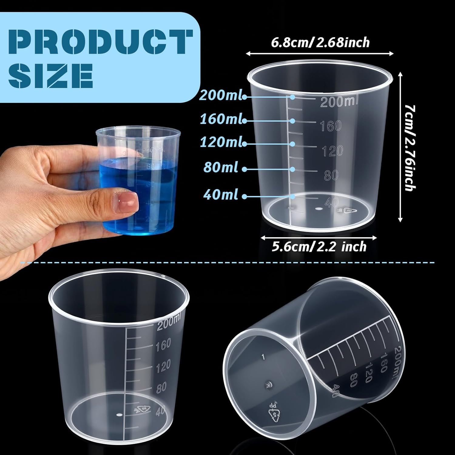 Features: Plastic mixing cups 200 pack of approximately 6.8oz/200ml plastic mixing cups is the ultimate bulk solution for your epoxy resin, art, and kitchen needs. Made from food safe pp plastic, these sturdy disposable cups are nice for measuring both liquid materials and cooking ingredients. Featuring clear measurement markings, they ensure accurate mixes and reduce waste. The stackable design saves storage space, making them a convenient and efficient choice for all your projects. Specifications: Material: plastic Color: clear Size: approximately 6.8oz/200ml Package includes: 200 x Plastic mixing cups Notes: Manual measurement, please allow slight errors on size. The color may exist a slight difference due to different screen displays
