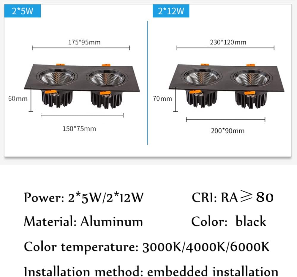[product information]Product size: (please refer to the size chart).2*5W, diameter: 175*95mm; height: 60mm; opening size: 150-75mm.2*12W, diameter: 230*120mm; height: 70mm; opening size: 200*90mm.Size conversion: 1 mm = 0.039 inches.Material: Aluminum.Color: black. (pictured).Light source type: LED chip.Color temperature: (3 color temperatures can be selected).White light: 6000K-6500K.Neutral light: 4000K-4500K.Warm light: 3000K-3500K.Color rendering index: RA≥80.Installation method: recessed embedded.Service life: 50000 hours.Power: 2*5W, 2*12W.Voltage: 90-260V.Applicable space: bar, dining room, kitchen, study, living room, bedroom, bar, coffee shop, etc.Packing list: 1* Downlight.
