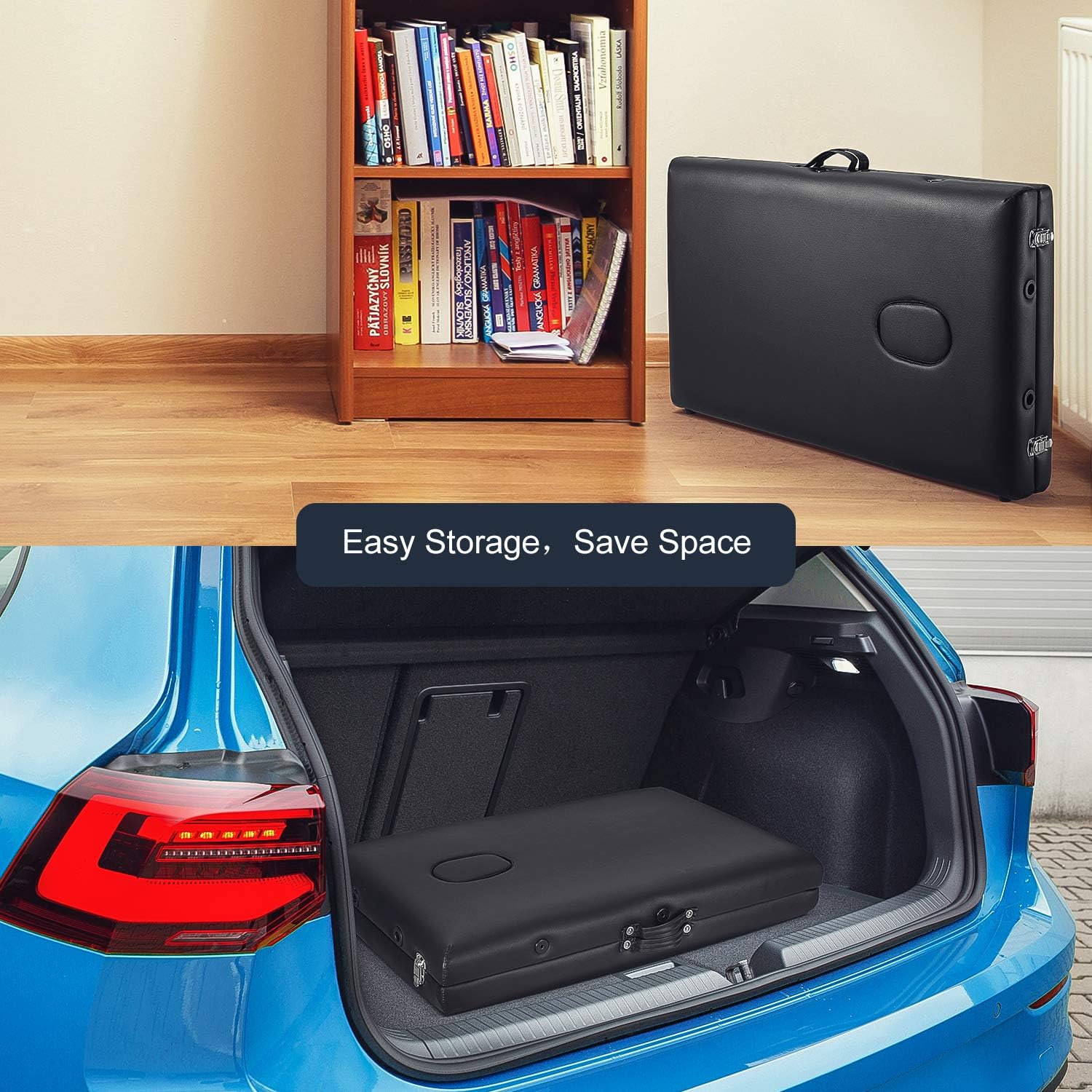Massage Table Portable with Carrying Bag Height Adjustable This portable massage table combines luxurious comfort in a convenient, fold-and-carry design ideal for both certified massage therapists, as well as at-home bodywork enthusiasts. The table features professional-grade craftsmanship, including a sturdy wooden frame along with aluminum push-button adjustable legs which offer quick, easy and accurate height adjustment. Its support cables are composed of high-quality steel providing solid support for up to 496 pounds. Ultra-padded with a deluxe 2inch high-density foam that provides ample support while contouring to the body. It is constructed with an adjustable headrest and removable winged armrests for additional customizable comfort. Features Skin-Friendly & Soft - The spongy cushion of This massage table is soft and made of high-resilient foam. Top grade durability & comfort level. PVC leather covering of This massage bed is waterproof and oil-proof. Foldable & Portable - This massage bed includes a free carry case and can be folded up. And this spa bed weighs only 34 LBS and can be carried by one person. Height Adjustable - Height of this massage table can be adjusted from 24 to 35 in for your need. You can to press the small round knobs on the legs to adjust height of this spa bed. Detachable Headrest & Armrest - Headrest, armrest and hand pallet of this massage table can be removed for versatile use. Their metal supports can be folded for easy storage. Stable & Durable Massage Table - This massage table uses beech wood frame, which are sturdier than ordinary wood. Specifications Weight Capacity of Massage Table: 496 LBS Dimensions of Massage Table: 84in x 23.6in x 24 - 35in Included 1 x Professional Grade Massage Table 1 x Adjustable Headrest 2 x Armrests 1 x Nylon Carry Case 1 x Arm Sling 1 x User manual