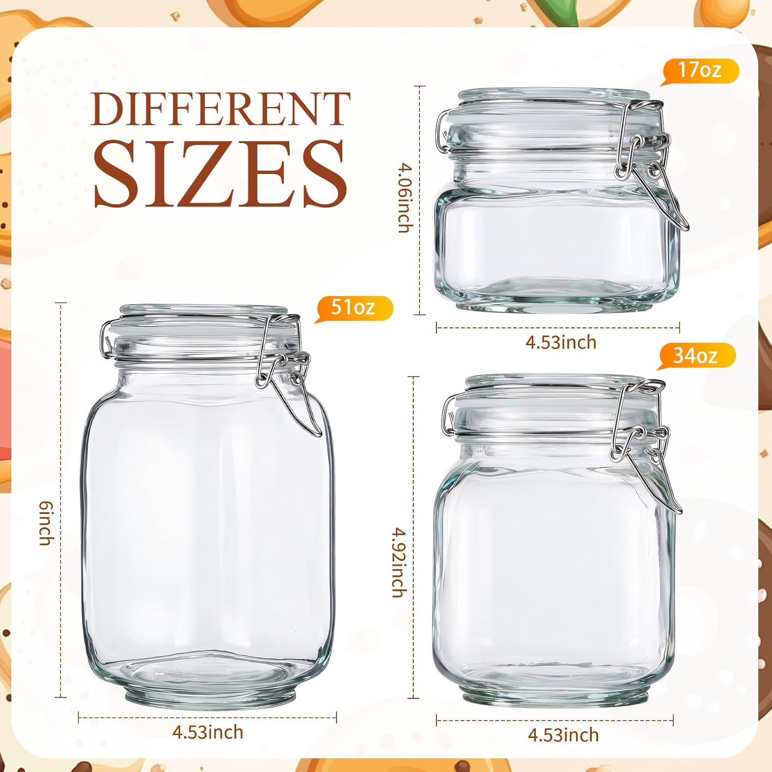 Features: Our glass ornaments can also be used for party decorations. Add string lights, candles, and other decorative items to the jars and hang or place them in a corner to instantly enhance the party atmosphere. You can also give this airtight glass jar set as a gift for a friend, wedding, or housewarming party to enhance your relationship. Specifications: Material: main glass, metal Color: clear Three sizes: 17oz, 34oz, and 51oz. Package includes: 12 X 17oz small mason jars 8 X 34oz medium mason food jars 4 X 51oz glass food storage jars Notes: Manual measurement, please allow slight errors on size. The color may exist a slight difference due to different screen displays