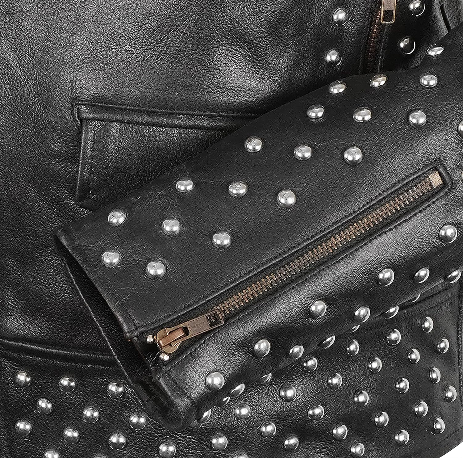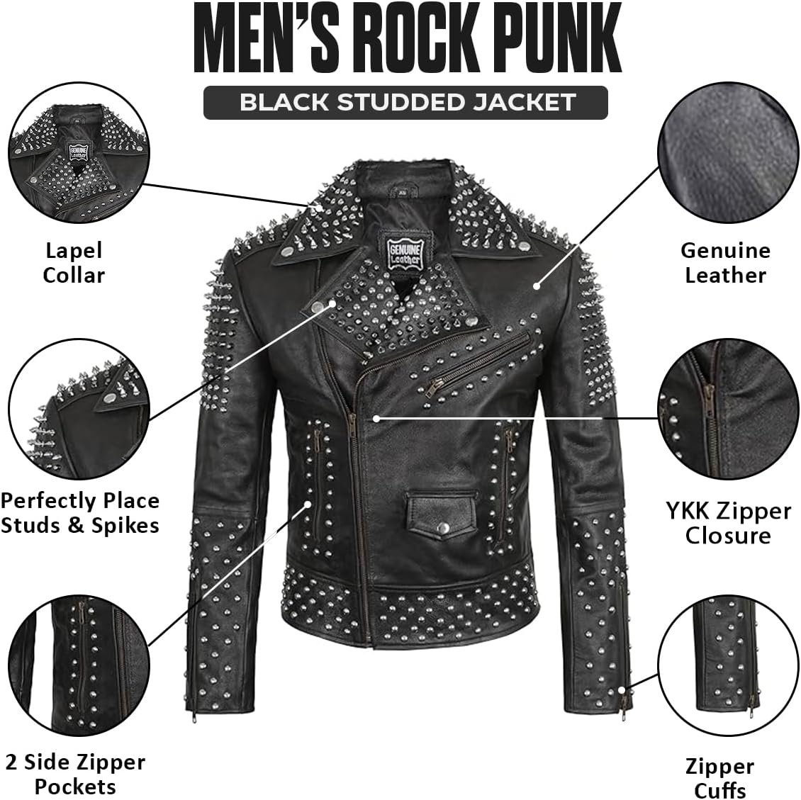 Unleash your inner rockstar with the Men's Black Motorcycle Genuine Leather Golden Spiked Jacket. This iconic piece is a must-have for anyone looking to make a bold statement. Crafted from high-quality genuine leather, this jacket combines the raw edge of rock punk style with the timeless appeal of biker fashion. Featuring meticulously placed golden studs and spikes, this Brando biker jacket exudes an unmatched aura of rebellious sophistication. Whether you're hitting the open road or taking center stage, this spikes studded jacket is designed to turn heads and command attention. The bold black add a touch of glam, making it perfect for those who aren't afraid to stand out. spiked jacket has zipper cuffs, full grain leather jacket men has multiple zipper pockets, rockstar jackets has zipper closure, biker jacket with spikes is made from genuine cow hide leather, black brando biker jacket has soft inner lining. Wear it with confidence and let your style speak volumes. Embrace the spirit of rebellion and rock n roll with the Men's Black Motorcycle Genuine Leather Spiked Jacket. It’s more than just a jacket it's an attitude.