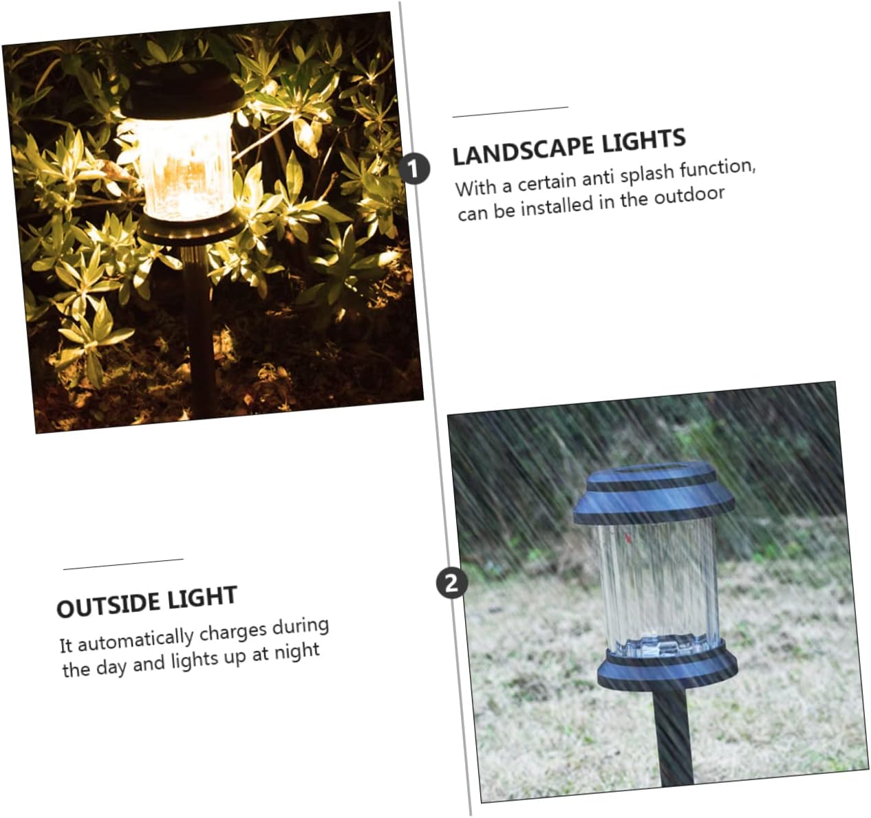 Package List 6 Characteristics - Working Time: About 8h Night Light. - Voltage: 1.2V Solar Lamp. - Material: Plastic, Solar Panel, Battery Ground Plug Lamp - Color: Assorted Color Lawn Lamp. - Size: About 42X10X10cm/16.51X3.93X3.93inch Outside Light. - Protection Grade: IP65 Landscape Lights. - Creative and unique look make it more attractive, and it is in use Solar Light. - High solar power converting ability. with low power consumption Landscape Light. - , it is and environmental protection Road Light. - Adoption of , this product is , handy and long-time use Ground Insert Lamp. - Suitable for gardens, lawns, walkways, courtyards, yards, parks, etc. decor use Garden Light.Goods DescriptionLawn Lamp for garden lighting, decorating your lawn, patio, yard and all other outdoor pursuits that would from beautiful lighting to create a wonderful and relaxed atmosphere.Solar Light Made by material, and have more longer service life