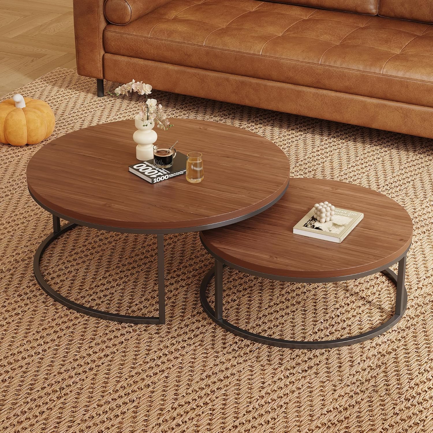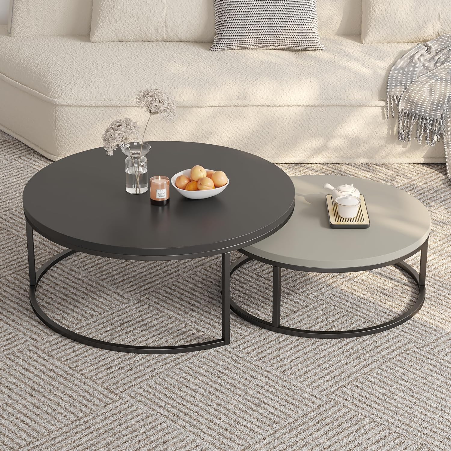 This modern round nesting coffee table set brings a clean and stylish touch to any living space. Featuring two tables in 31.5" and 23.7" sizes, it allows flexible arrangement—use them together for layered style or nest the smaller table underneath to save space. The smooth dark gray/light gray wood-grain tabletops pair perfectly with sturdy black metal legs, creating a balanced look that fits modern, industrial, or minimal interiors. Built with durable materials, each table supports daily use with excellent stability and long-lasting strength. Whether you’re placing it in the living room, bedroom, lounge, or office, this versatile nesting set offers generous display space while keeping your home tidy and clutter-free. Easy assembly makes it a practical and elegant addition to any room.