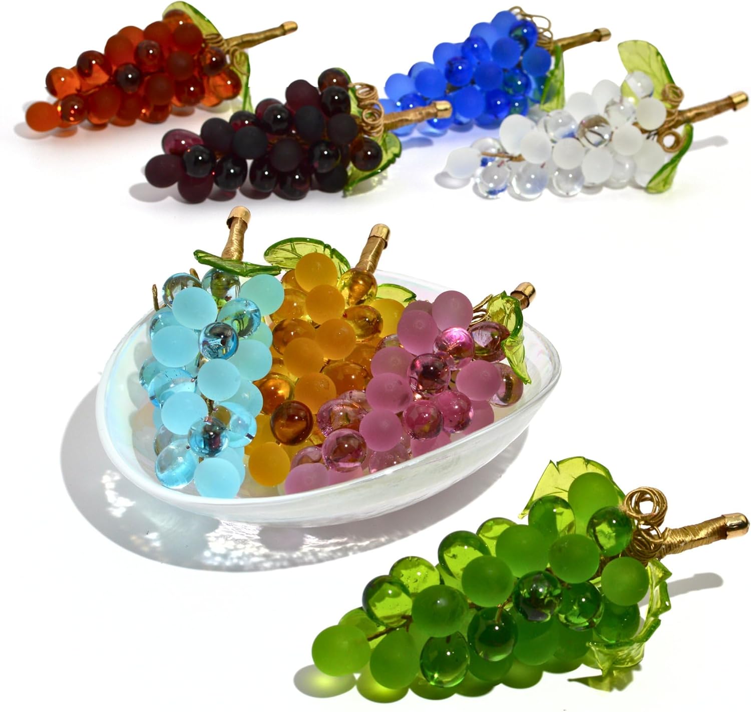 Bring a touch of Italy to your home with our Handmade Murano Glass Grape Cluster Figurine. This exquisite piece combines the elegance of blown glass decor with the timeless charm of Italian kitchen decor, making it the perfect addition to your space. The vibrant color of the grapes mimics amazing grapes from a real vineyard, making them a standout as both wine decor for the kitchen and as a centerpiece for any Italian dinner party decorations. While these might look like real grapes, they’re actually faux fruit – durable, beautiful, and perfect for long-lasting fruit decor. Whether you're hosting a gathering or sprucing up your space, this glass figurine can be used in endless ways. It makes a fantastic statement at wine kitchen decor events or as a centerpiece at an Italian dinner party. Not just for parties, the decorative fruit is perfect for year-round decor. Imagine them displayed with frutas artificiales decorativas on your table or as grape vines for decorating a Christmas vase filler stems display. This artificial grape vine will have your guests doing a double-take, mistaking them for the real thing! Elevate your home with this timeless piece of blown glass decor, perfect for those who adore Italian decorations, faux fruit, and collectible figurines. Whether you're an art collector or just someone with an eye for glass decorations, this beautiful grape cluster will leave a lasting impression. Ideal as wine decorations for party, grape decorations, or even an eye-catching glass paperweight, this hand blown glass decor is a versatile accent. Mix and match with plastic grapes for decoration, uvas artificiales para decorar, or frutas artificiales to create a captivating centerpiece. This stunning crystal figurine is also a thoughtful gift for lovers of artificial fruits or grape decor. Bring home the beauty of glass fruit and enhance your space with these decorative grapes – a true masterpiece in the world of blown glass figurines!
