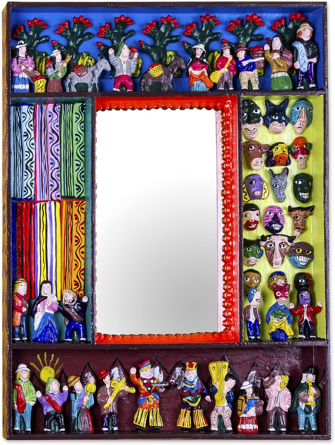 NOVICA, in association with National Geographic, works together with talented artisan designers around the world to produce stunning, keepsake treasures. Our mantra is to spread global happiness, so rest assured - we’ll do everything we possibly can to ensure you’re a happy customer. About this item: Alejandro Chávez crafts a mirror frame rooted in Andean tradition. Varied scenes represent Carnavalito (Little Carnival), a celebration held in the Peruvian Andes. Musicians play traditional instruments, participants re-enact the birth of Jesus, incredible masks hang on the wall, and a couple stands beneath a towering prickly pear cactus. Known as a retablo, this traditional diorama is housed in a colorful chest crafted of wood and painted. Chávez carefully models each figure from ceramic plaster and paints them by hand. Frame: 11.75" H x 9.0" W x 1.4" D Mirror: 3.3" W x 6.25" H - Signed by the artist About our Artist: Andean artisan Alejandro Chavez creates retablos – colorful dioramas unique to the Ayacucho region of Peru. Each tiny figure is shaped and painted by hand, and displayed in a delightful tableau. 'In every one of my works you can find the labors of my wife, who molds the characters, as well as that of my nieces and nephews, whom I currently teach,' he says. The customs and traditions of the Andean people emerge in every retablo.