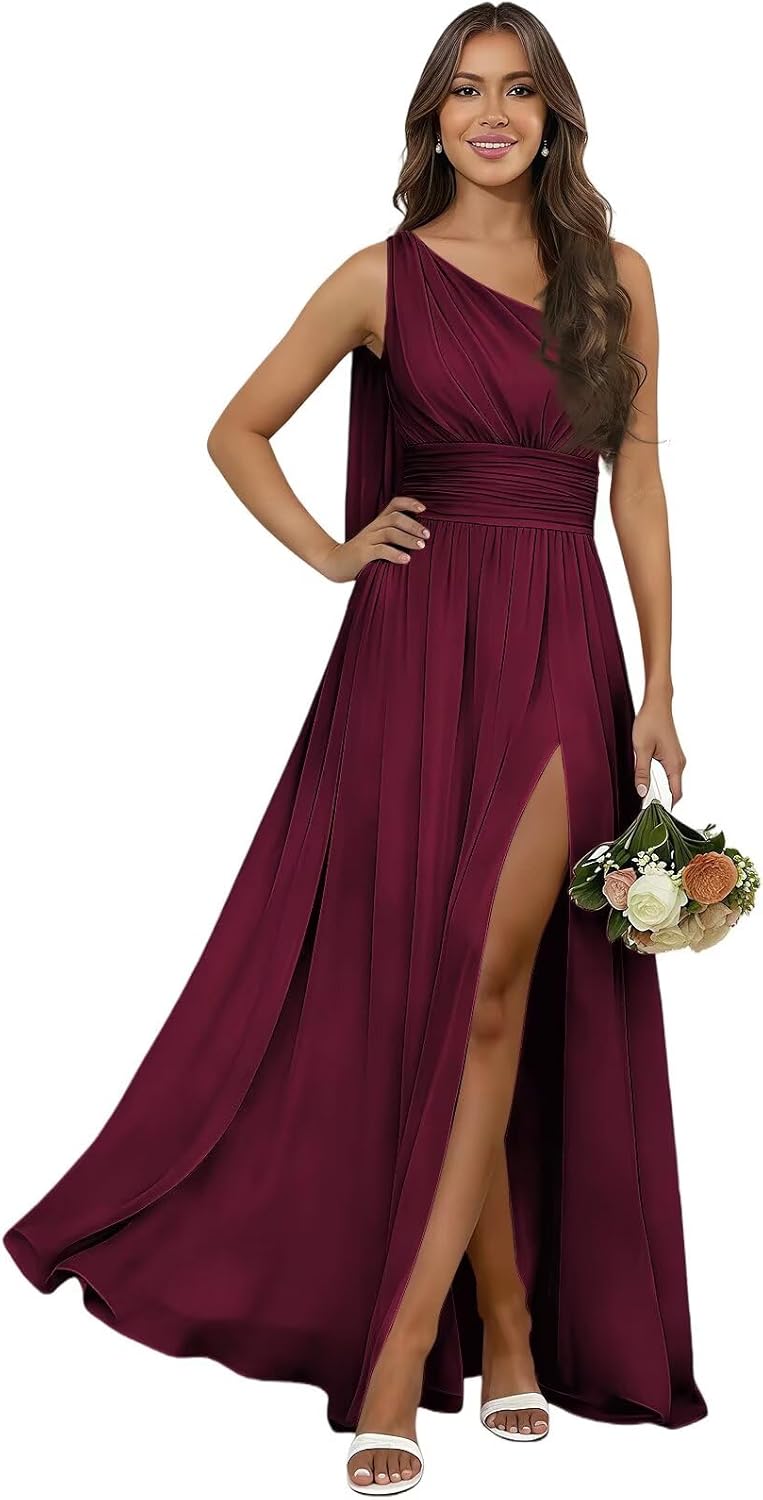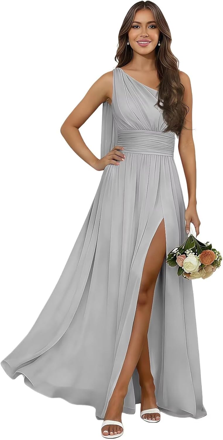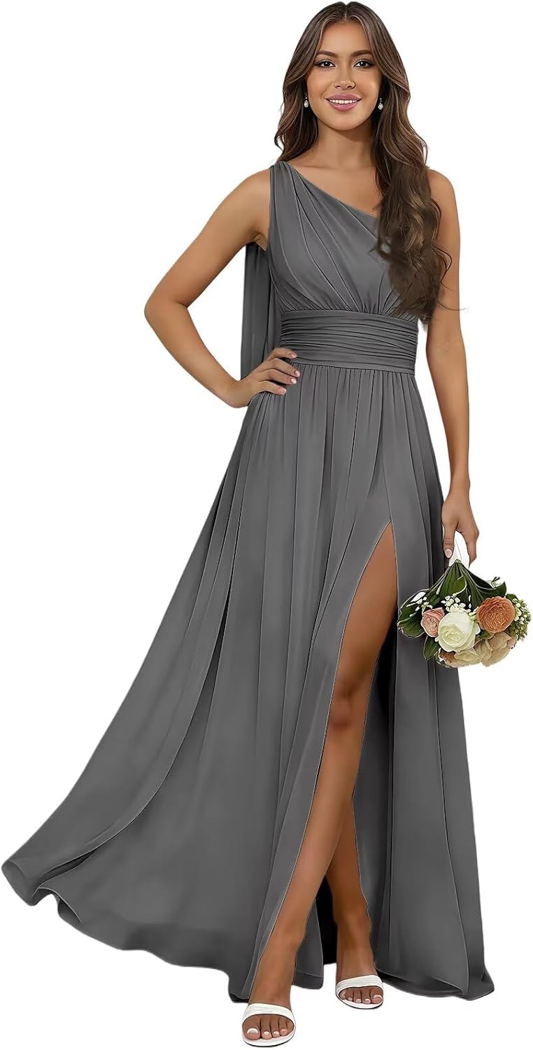 One Shoulder Bridesmaid Dresses with Scarf Long Chiffon Pleated Formal Evening Gowns with Slit HOW TO CHOOSE A CORRECT SIZE of this Bridesmaid Dress? 1:Measure your waist ,bust ,hips size and compare with our own size chart. 2:If your measurements are between two sizes, please choose the bigger one. 3. We provide free customized service, just send your accurate measurements as follow. - Bust (the biggest circle of chest) - Waist - Hip (the biggest circle of hip) - Hollow to Floor - Natural Height without shoes - Heels Height