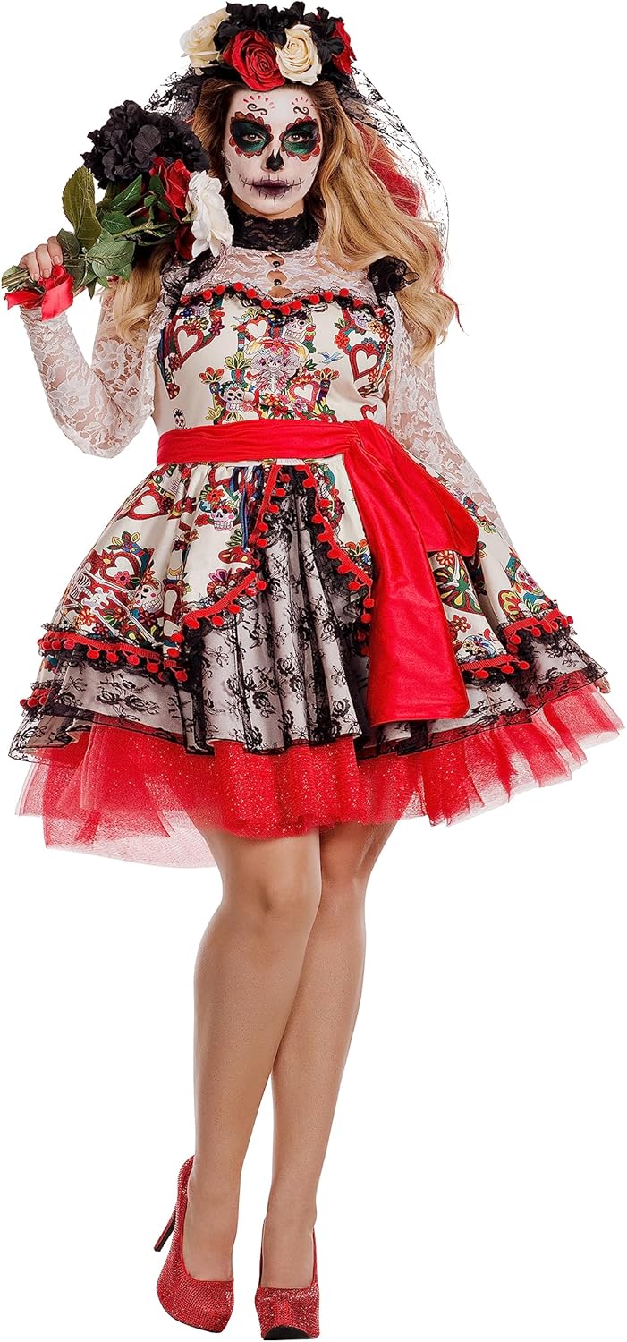 Plus size La Novia Day of the Dead bride dress with intricate day of the dead print, lace details, pom-pom trim and tulle accents. Comes with waist sash and matching headpiece. Multi. Bouquet not included.