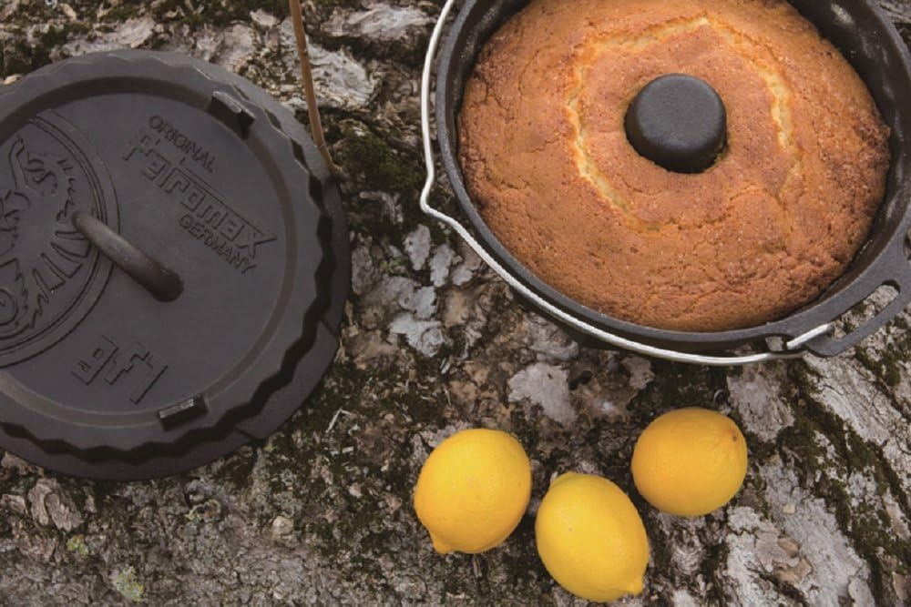 The chimney shape in the center allows for even heat distribution from the center The lid is flipped upside down and can be used as a frying pan. Perfect shape for baking ring cakes and breads. The lid can be flipped upside down to bake tarts.