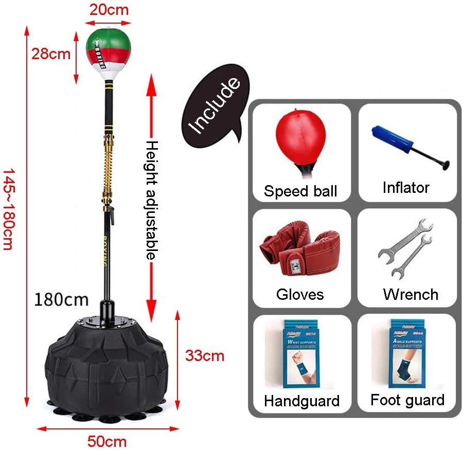 Perfect for Stress Relief and GrowthThe boxing speed ball is an excellent way to vent emotions and helps improve your mood. It also makes a unique and thoughtful gift for your child, supporting their growth and development during childhood.Product Specifications:- Name: Boxing Speed Ball- Material: PU + Steel- Color: Black- Base Size: 50 cm (19.7 inches)- Adjustable Height: 145-180 cm (56.3-70.9 inches)- Suitable For: Children, teenagers, adults, and seniors- Ideal Locations: Living room, balcony, study room, gym, and moreImportant Notes:1. Sales Listing: This product includes only the boxing speed ball; all other items shown are for reference only.2. Color Variation: Please note that color differences may occur due to display screens or lighting during photography.3. Size Accuracy: Measurements may have a slight variation of 1-2 cm due to different measuring methods; please understand.Enhance your mood and fitness with this versatile boxing speed ball, suitable for all ages and environments.