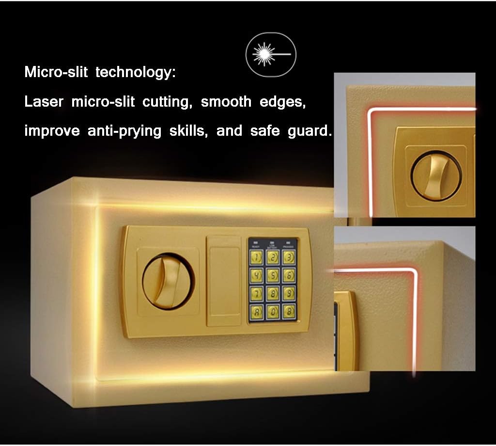 ? Product Description: Stylish design, small and convenient ? Technical indicators Product Name: Electronic safe Material: low carbon high density alloy steel Dimensions: External dimensions: 31x20x20cm / 12.2x7.8x7.8 inches (WxDxH) Internal size: 30x16x19cm / 11.8x6.2x7.4 inches (WxDxH) Weight: 5.5kg/12.1lb Product accessories: key, expansion screw Box thickness: 1mm/0.07 inch door thickness: 2mm/0.03 inch Door type: single door Opening method: password + turntable Scope: family / office / hotel / catering ? Package Contents: 1 x safe, 2 keys 2 fixing bolt for fixing the safe to the wall or floor 1 x User Manual / Accessories Description Tip: Do not put the emergency key into the safe! ! ! ? Installation method: can be fixed / can enter the wall ? Features: Solid cylindrical lock: all steel, bold lock One-click hidden lock Security code 3-8 bits use any number between 0-9 Made of 1 mm thick solid steel Installed on the floor, wall or cabinet ? Tip: 1. We only sell safes and do not include other things. 2. Due to different measurement tools and measurement methods, there may be an error of 1-3 cm. 3. Due to the difference between light and display, the color of the image may be biased. Please refer to the actual product.