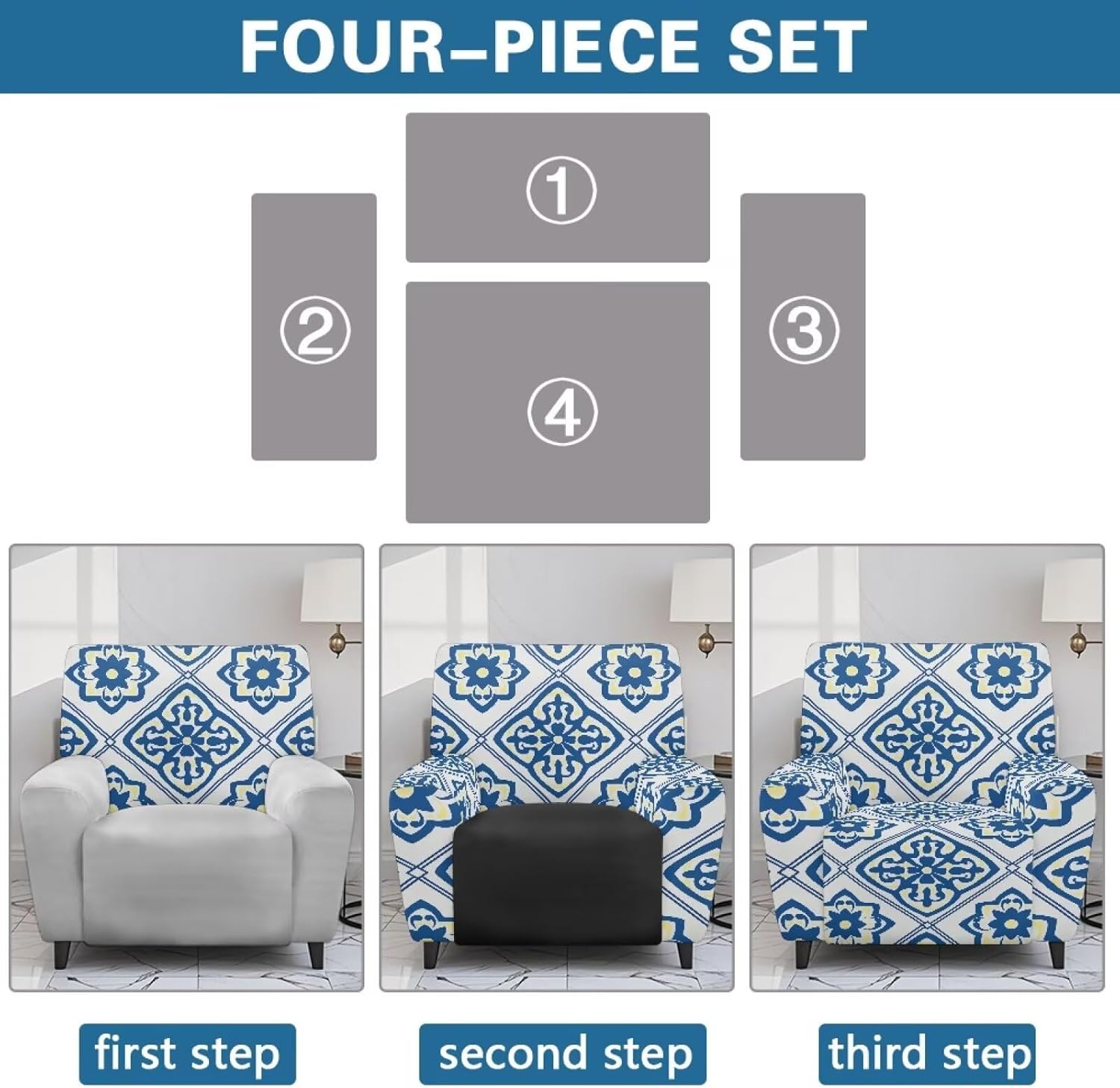 【Material Composition】Polyester+Spandex【Design Features】Full elastic edge with secure straps for non-slip fitIntegrated armrest covers with functional storage pocketsStretch fabric conforms to chair shape without wrinkling【Protection Performance】Resists spills, stains, and pet damageDurable construction prevents fading and wear【Size Specifications】Fits recliners 26in-35in Depth x 27in-37in Width x 30in-41in Height, Measure your recliner's depth, width, and height before ordering.【Usage Scenarios】Ideal for living rooms, apartments, and pet-friendly households. Perfect for refreshing old furniture or protecting new investments. Suitable for most recliner styles with arms.【Note】 Because of different measurement methods, pls allow 1in error.