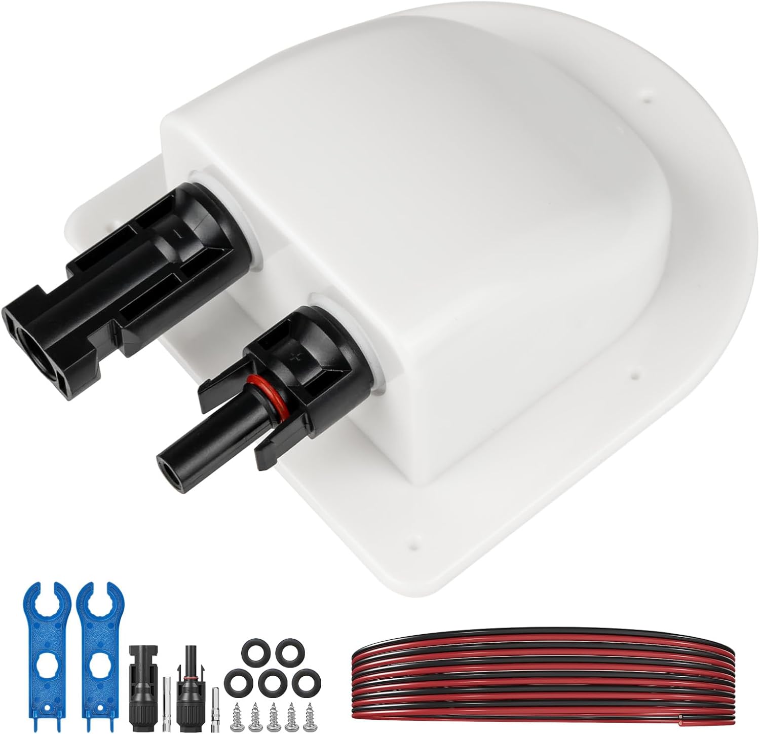 • Universal Compatibility: Dual-entry design supports 2 cables (e.g., positive/negative) through a single gland, minimizing roof penetrations. Compatible with most 12V/24V solar panels, RVs, boats, yachts, and off-grid systems. Kit includes 1 entry housing, 2 solar connectors, 5 screws, 5 rubber gaskets, and 6mm² photovoltaic cable