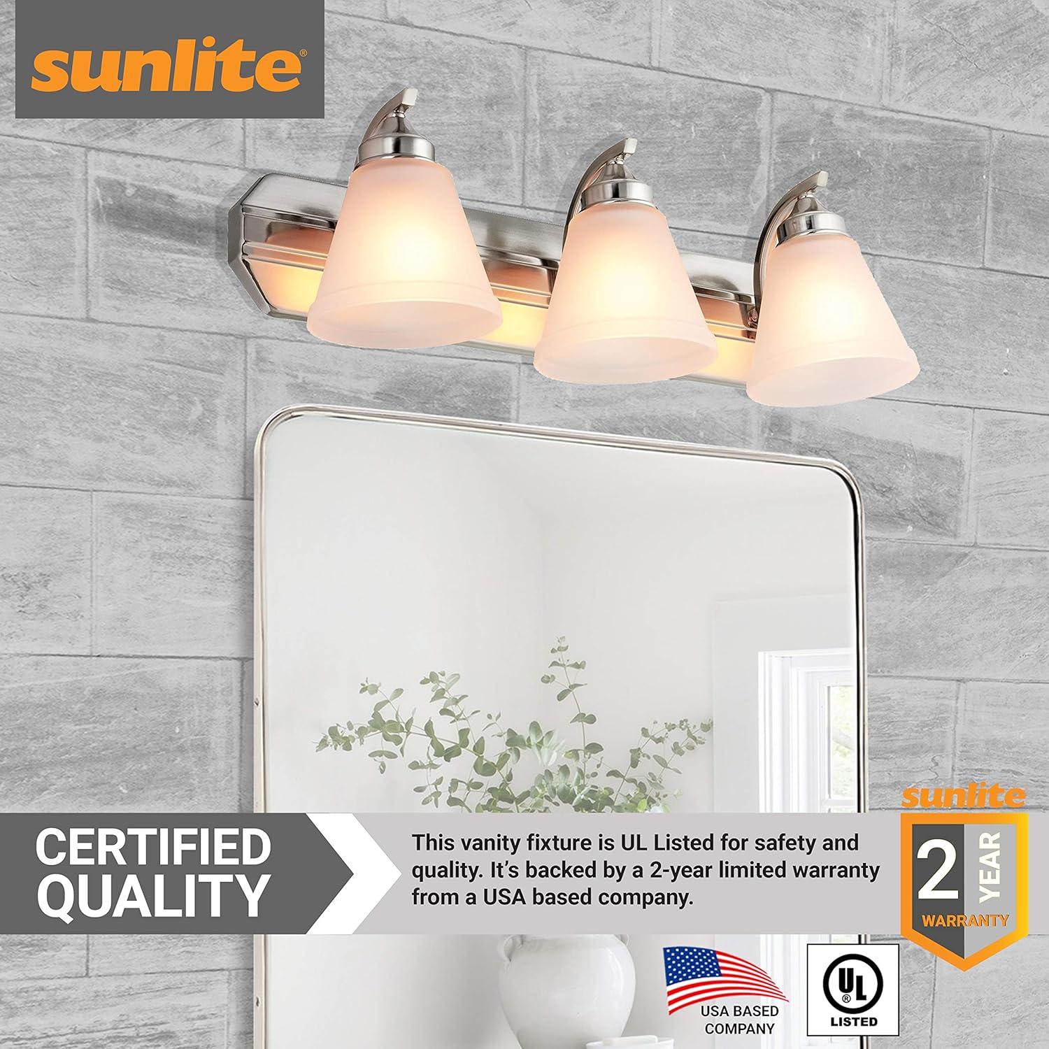 Sunlite's three light classic design vanity fixture will bring a fresh and traditional feel to your bathroom. Its elegant bell-shaped frosted glass will complement any decor. It is ideal for bathrooms, foyers and living rooms. This fixture is reversible and can be used for up or down light. Uses 3 standard A19 bulbs with a medium E26 base (100 watts max, not included). UL Listed for damp location to meet the highest safety standards. Fixture measures 6.33” W x 7” H x 24” D.