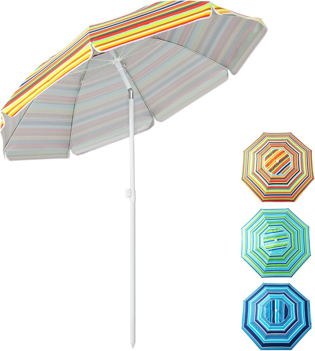 DescriptionEnhance your beach day or outdoor picnic setup with this sunshade umbrella!This beach umbrella is made of polyester fabric with a silver coating for excellent sun protection. The outdoor umbrella with vented top keeps you cool in the shade. You can tilt the seaside umbrella to a desired angle so you can be covered no matter where the sun moves. The thick metal pole pairs with 8 2-tier sturdy fiberglass ribs ensure excellent stability and sturdiness. To make the sunshade shelter more stable, you can screw the sand anchor into the sand. The portable umbrella weighs only 5 pounds, making it easy to carry around and make your beach trip easier. Enjoy the leisure time with your family and friends!Feature8 reinforced fiberglass ribs make the umbrella more stable and durablePremium polyester fabric is resistant to fading and drizzleFeatures silver coating interior to provide you with UPF 50+ sun protectionThe vented top for efficient ventilation and heat dissipationThe push button tilt design allows for all-day sun protection1 click push button design allows the umbrella to be quickly foldedThe lightweight & portable design makes it easy to bring alongSuitable for patio, beach parties, picnics, and campingSpecificationColor: As Pictures ShowMaterial: Polyester Fabric, Silver Coating, Fiberglass, MetalOverall Dimensions: 6.5' x 6.5' (Dia. x H)Diameter of the Pole: 1.3"Diameter of Each Cup Holder: 2.5"Folding Size: 6" x 48.5" (Dia. x H)Net Weight: 5 lbsPackage Includes:1 x Beach Umbrella1 x User's Manual
