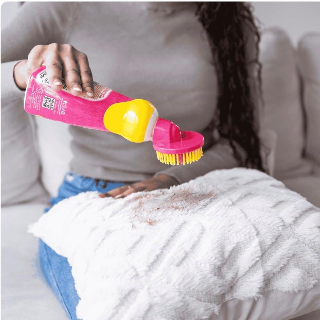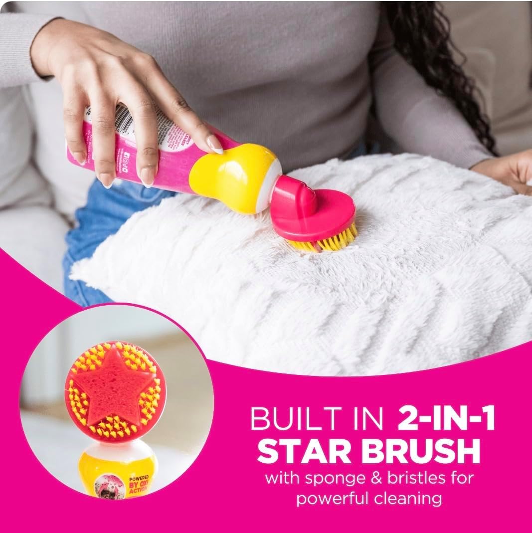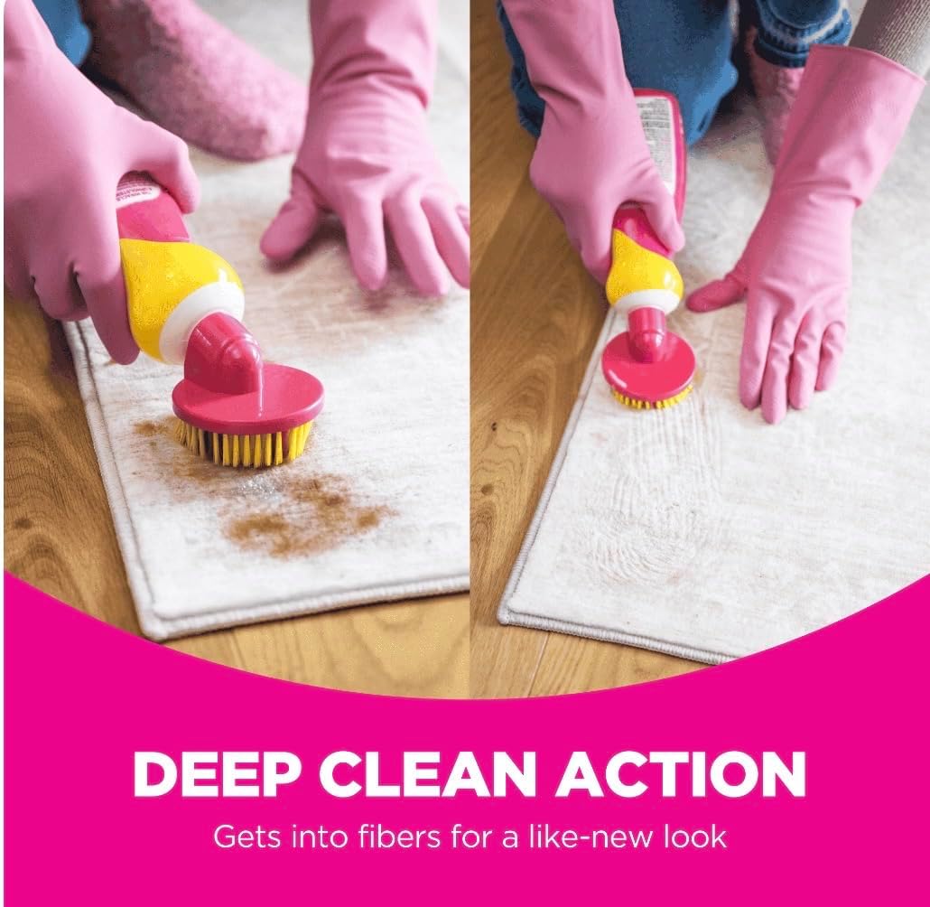 Transform your cleaning routine with this powerful carpet and upholstery cleaner in an eye-catching pink bottle. The dual-action spray formula tackles tough stains while featuring a built-in brush head for deep cleaning action. Perfect for refreshing carpets, rugs, and upholstered furniture, this cleaner helps remove stubborn spots and marks. The innovative brush-top applicator allows you to work the cleaning solution directly into fibers for maximum effectiveness. Ideal for treating high-traffic areas, pet accidents, food spills, and everyday dirt. The ergonomic bottle design makes it comfortable to use while the targeted spray ensures precise application where you need it most. Keep your home looking fresh and clean with this versatile cleaning solution that works on multiple fabric surfaces.