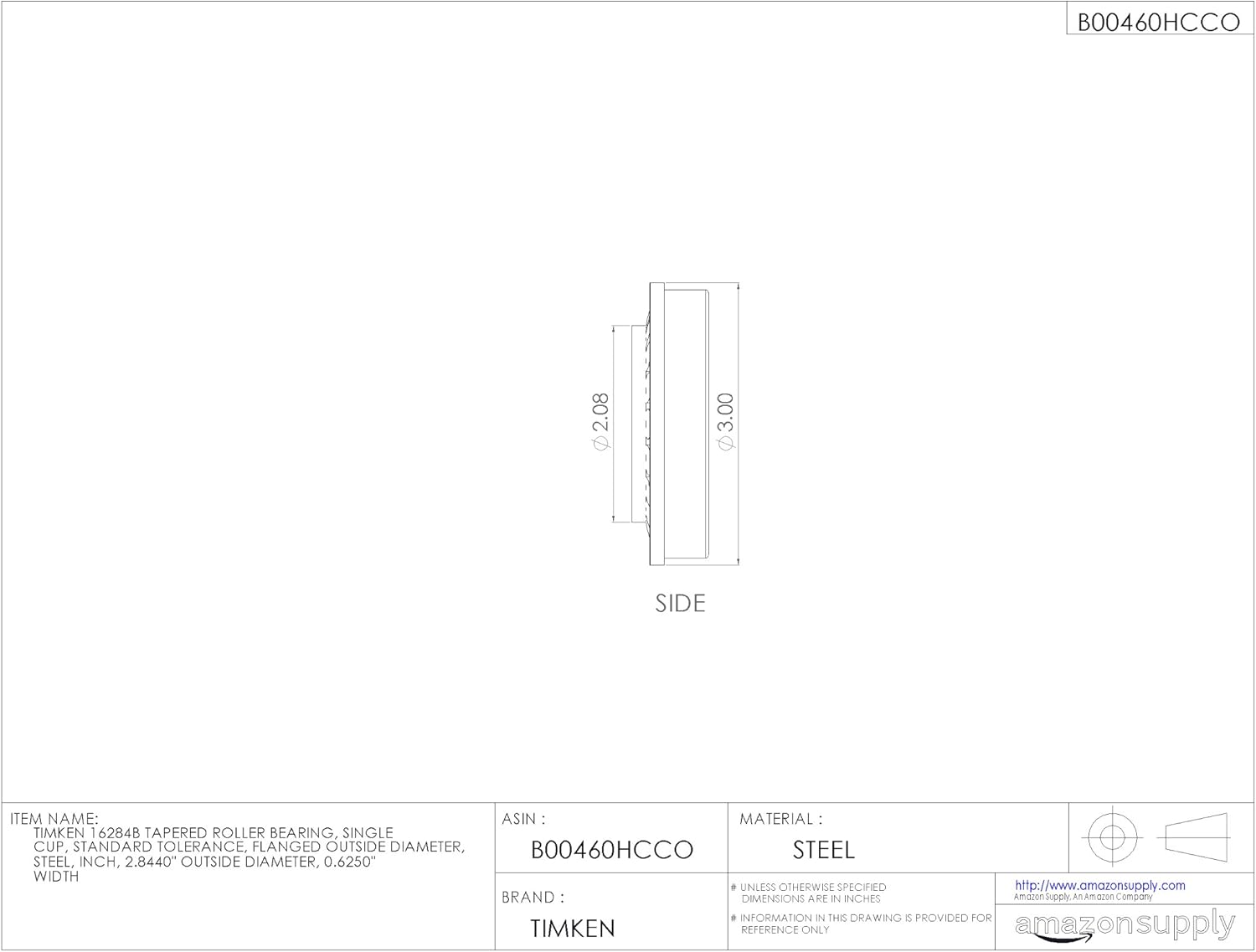 This Timken 16000 Series single cup is matches with a single cone (inner ring assembly, sold separately) to assemble into a complete single tapered roller bearing, suitable for applications that support both radial and axial loads. This cup is matched to its cone assembly based on the load that the bearing needs to support, and if the bearing needs radial internal clearance to accommodate thermal expansion. Generally mounted in opposing pairs on a shaft to evenly distribute loads, this single tapered roller bearing assembly is stable in temperatures ranging from -54 to 120 degrees C (-65 to 250 degrees F). The single cup is made of Timken's high-alloy steel for durability, heat tolerance, and resistance to deformity under heavy loads. As part of a separable tapered roller bearing unit, this single cup has an open design that allows for lubrication and accurate adjustments. This single tapered roller bearing is for use in high-load, moderate-speed applications that include automotive axle systems and conveyor systems in heavy duty industries such as mining, construction and agriculture, among others.SpecificationsTapered roller bearings--Boundary dimensions and series designationsISO 355Inch part numbering systemABMA standard 19.2Width tolerance standardsISO 492Tapered roller bearing naming conventionsISO 720Rolling bearings use rolling elements to maintain the separation between moving parts to reduce rotational friction and support radial and axial loads. These elements can be one of the following types: ball, cylindrical, spherical, barrel, needle, spindle, or tapered. All rolling bearings are open, shielded, or sealed. Sealed bearings are lubricated with oil or grease in the bearing factory, while open and shielded bearings are meant to be lubricated in place, with periodic reapplication of lubrication, based on use. The shield protects the working parts of the bearing from environmental debris that may be introduced and could reduce the ball bearing speed and lifespan. Rolling bearings are used in a range of applications from agricultural machinery to conveying equipment, robotics, dental equipment, elevators, rolling mills, ship rudder shafts, and aggregate crushers, among others.The Timken Company manufactures a variety of bearings, alloy steels, and related components and assemblies that meet International Organization for Standardization (ISO) standards for quality assurance. Founded in 1899, the Timken Company is based in Canton, Ohio.