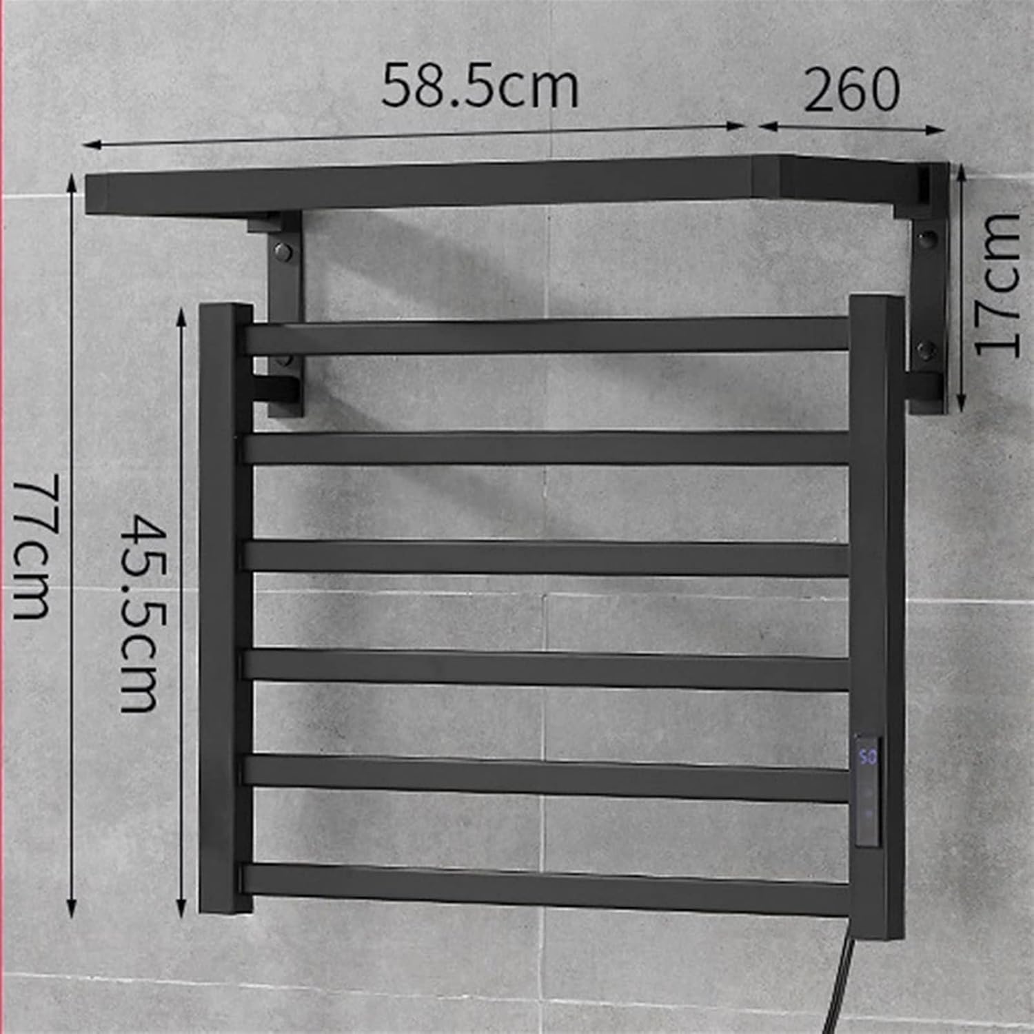 GREAT FOR SMALL SPACES: This space-saving drying rack provides space to air dry clothing, towels, delicates, lingerie, sports bras, yoga pants, athletic gear and more without taking up any floor space; Easily mounts on a flat wall surface with the included hardware; Use in laundry rooms, utility rooms, kitchens, bathrooms, garages or on balconies; A great laundry drying system for small-space living in college dorm rooms, apartments, condos, RVs and campersNote: 1.Please allow 1-3cm (0.4-1.18") difference due to manual measurement and slight color variation for different display setting.2.With curve heated bars,heating up a few hours in advance when needed,you will feel warm and soft towels after shower or in the cold morning.Power: Small: 58.5*45.5cm\\u2014\\u201472wMedium: 58.5*77cm\\u2014\\u201472wLarge: 59.5*82.6cm\\u2014\\u2014133wSpecifications:Material: Aluminum alloyInstallation method: punchDistance from the wall: 6.2-6.7cmRated Voltage And Frequency: 110-220VHeating Temperature: 50-70 Celsius (122-158 Fahrenheit)One-key constant temperature: 55 CelsiusWater Protection Rating: IPX4